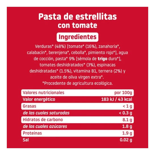 Des petits pots tout simplement délicieux, fabriqués de manière naturelle, artisanale et écologique avec des morceaux d'aliments pour apprendre à mâcher, à base d'étoile et de concentré de tomates. Idéal pour les bébés à partir de 10 mois.