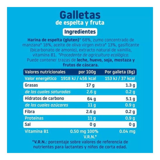 FARINE D'ÉPEAUTRE*68%, JUS DE POMME CONCENTRÉ 18%, HUILE D'OLIVE EXTRA VIERGE*12%, AGENT DE CUISSON (BICARBONATE D'AMMONIUM), EXTRAIT DE VANILLE