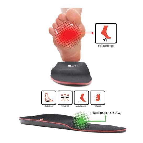 Semelles pour soulager la douleur causée par la métatarsalgie, une affection qui provoque des douleurs et des inflammations dans la plante du pied, au niveau du métatarse. Elles sont fabriquées en latex et comportent un coussinet métatarsien avec une barre rétrocapitale, qui favorise le reste de la zone affectée. Elles sont dotées d'une doublure en microfibre absorbante, qui facilite la transpiration du pied, et d'une "mousse à mémoire de forme" qui assure un excellent amortissement. Elles peuvent être utilisées par les hommes et les femmes. Elles conviennent aux pieds diabétiques et gériatriques. Comprend 1 paire de semelles de taille 35-36.