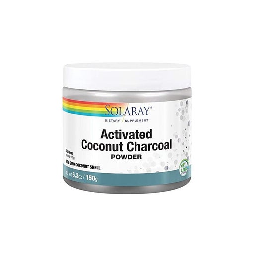 Solaray Activated Coconut Charcoal Powder 150g est un complément alimentaire en poudre à base de charbon actif, une poudre dérivée de la coque de noix de coco.