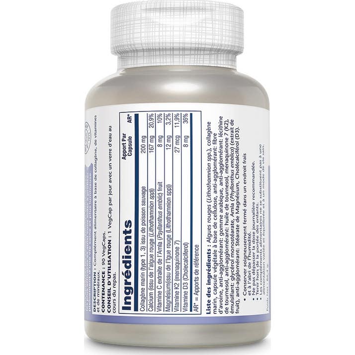 Solaray® Collagen Bone Complete est un complément alimentaire formulé pour fournir un soutien avancé à la matrice osseuse, avec du collagène marin de type I, III, un complexe minéral d'algues et les vitamines K2, D3 et C. La matrice osseuse est la structure interne des os et fournit les caractéristiques et propriétés spécifiques de l'os.