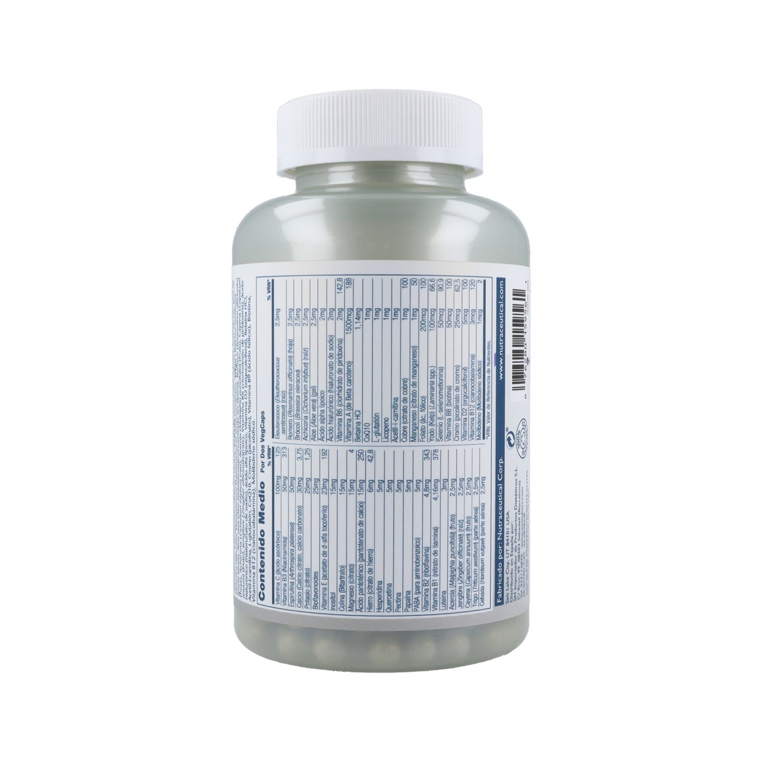 VITAMINE C (L ACIDE ASCORBIQUE), VITAMINE B3 (NIACINAMIDE), SPIRULINE (ARTHROSPIRA PLATENSIS), CALCIUM (CITRATE DE CALCIUM), POTASSIUM (CITRATE DE POTASSIUM), BIOFLAVONOÏDES, VITAMINE E (ACÉTATE DE D-ALPHA TOCOPHÉROL), INOSITOL CUIVRE (CITRATE DE CUIVRE), BITARTRATE DE CHOLINE, MAGNÉSIUM (CITRATE DE MAGNÉSIUM), ACIDE PANTOTHÉNIQUE (PANTOTHÉNATE DE CALCIUM), FER (CITRATE DE FER), HESPÉRIDINE, QUERCETINE, PECTINE, PAPAÏNE, PABA (ACIDE PARA AMINOBENZOÏQUE), VITAMINE B2 (RIBOFLAVINE), VITAMINE B1 (NITRATE DE THIAMINE), BÉTA-CAROTÈNES, ÉQUIVALENT VITAMINE A 500 MCG, POUDRE DE CERISE D'ACÉROLA (MALPIGHIA PUNCIFOLIA) (FRUIT), POUDRE DE GINGEMBRE (ZINGIBER OFFICINALE) (RACINE), POUDRE DE CAYENNE (CAPSICUM ANNUUM) (FRUIT), POUDRE D'HERBE DE BLÉ (TRITICUM AESTIVUM), POUDRE D'HERBE D'ORGE (HORDEUM VULGARE), POUDRE D'ELEUTHEROCOQUE (ELEUTHEROCOCCUSSENTICOSUS) (RACINE), POUDRE DE ROMARIN (ROSMARINUS OFFICINALIS) (FEUILLE), POUDRE DE BROCCOLI (BRASSICA OLERACEA), POUDRE DE CHICORÉE (CICHORIUM INTYBUS) (RACINE), MUCILAGE DE LA FEUILLE D'ALOE VERA (ALOEBARBADENSIS), ACIDE ALPHA LIPOÏQUE, ACIDE HYALURONIQUE (HYALURONATE DE SODIUM), VITAMINE B6 (CHLORHYDRATE DE PYRIDOXINE), BETAÏNE HCL, LUTÉINE, LYCOPÈNE DE TOMATE, COQ-10, N-ACETYL L-CARNITINE, L-GLUTATHION, CUIVRE (CITRATE DE CUIVRE), MANGANÈSE (CITRATE DE MANGANÈSE), VITAMINE B9 (ACIDE FOLIQUE), IODE (TIRÉ DU VARECH) FUCUS VESICULOSUS, SÉLÉNIUM (L-SÉLÉNOMÉTHIONINE), VITAMINE B8 (BIOTINE), CHROME (PICOLINATE DE CHROME), VITAMINE D2 (ERGOCALCIFÉROL), VITAMINE B12 (CYANOCOBALAMINE), MOLYBDÈNE (SODIUM MOLYBDÈNE).