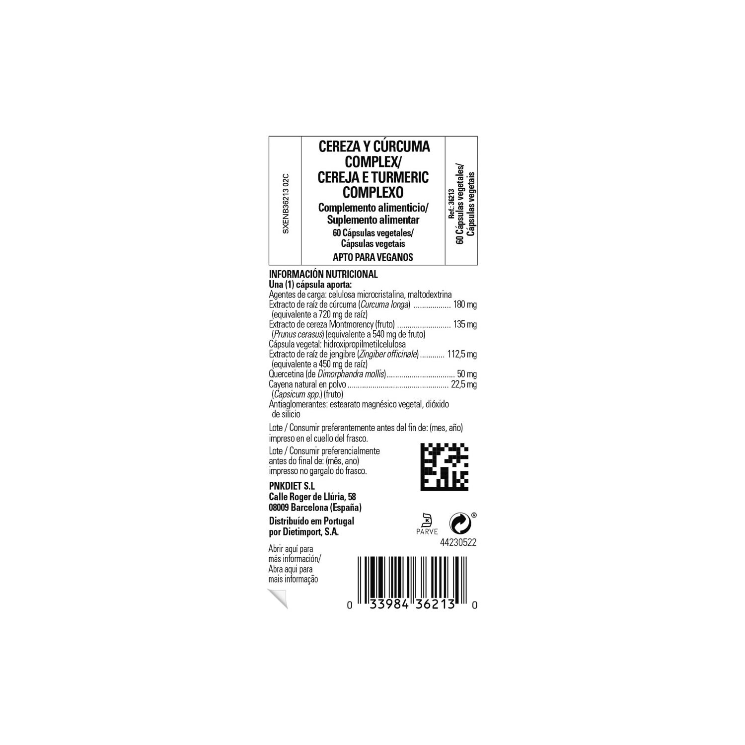 Complément alimentaire à base de cerise et de curcuma qui, grâce à sa fonction anti-inflammatoire, antioxydante et dépurative, aide à promouvoir l'énergie de l'organisme et régularise la flore intestinale en cas d'intestins sensibles, en améliorant sensiblement la digestion. Aide au bon fonctionnement des articulations, en évitant la rétention de liquide sur celles-ci. Convient aux végétaliens.