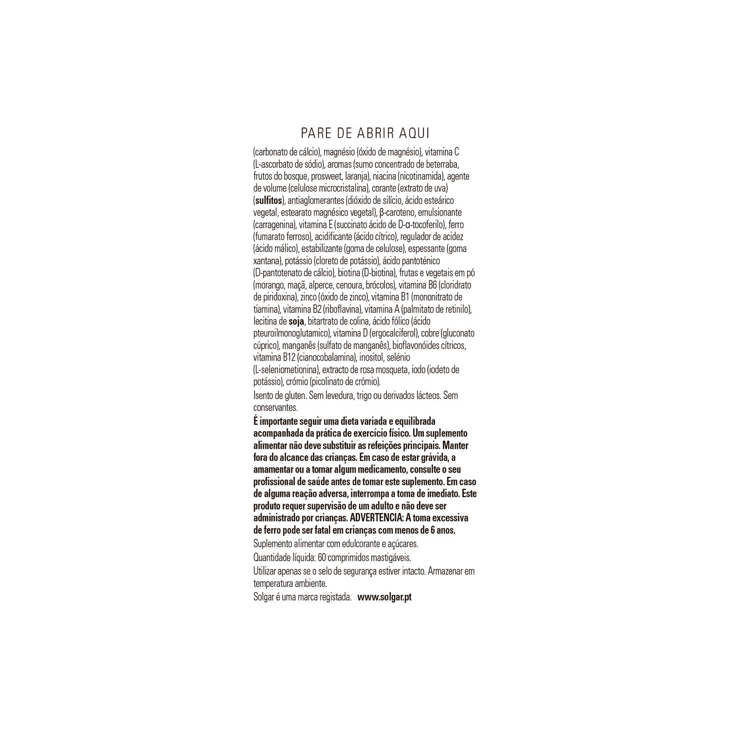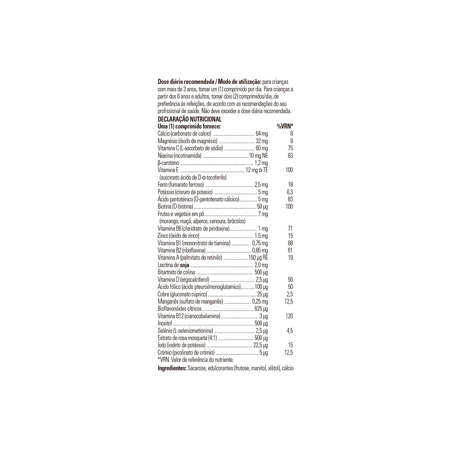 Vitamin A 1.4mg, Vitamin C 60mg, Vitamin D 2.5ug, Vitamin E 10mg, Thiamin (B1) 0.75mg, Riboflavin 0.85mg, Niacin 10mg, Vitamin B6 1mg, Folic Acid 100g, Vitamin B12 3ug, Biotin 50ug, Panothenic Acid Calcium 5mg, Iron 2.5mg, Iodine 22.5ug, Magnesium ( 32mg, Zinc 1.5mg, Selenium 2.5ug, Copper 25ug, Manganese 250ug, Chromium 5ug, Molybdenum Potassium Choline 500ug Sucrose, Fructose Mannitol Microcrystaline Cellulose, Natural Flavours Grape Skin Extract, Xylitol, Carrageenan Citric Acid, Malic Acid, Vegetable Cellulose, Xanthan Gum, Silica, Vegetable Magnesium Stearate, Vegetable Stearic Acid, Lecithin, Carrot Powder, Red Beet Powder, Strawberry Fruit Powder, Apple Fruit Powder, Broccoli Powder, Apricot Fruit Powder, Citrus Bioflavonoids, Inositol Rose Hips (fruit)