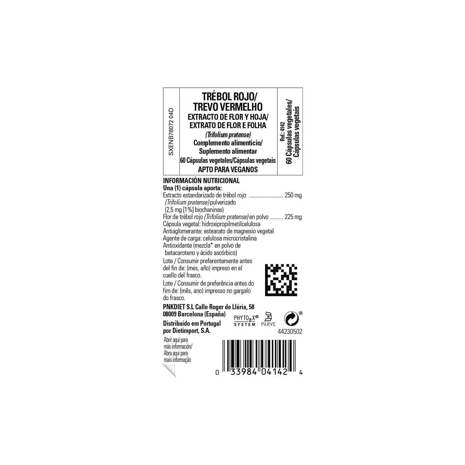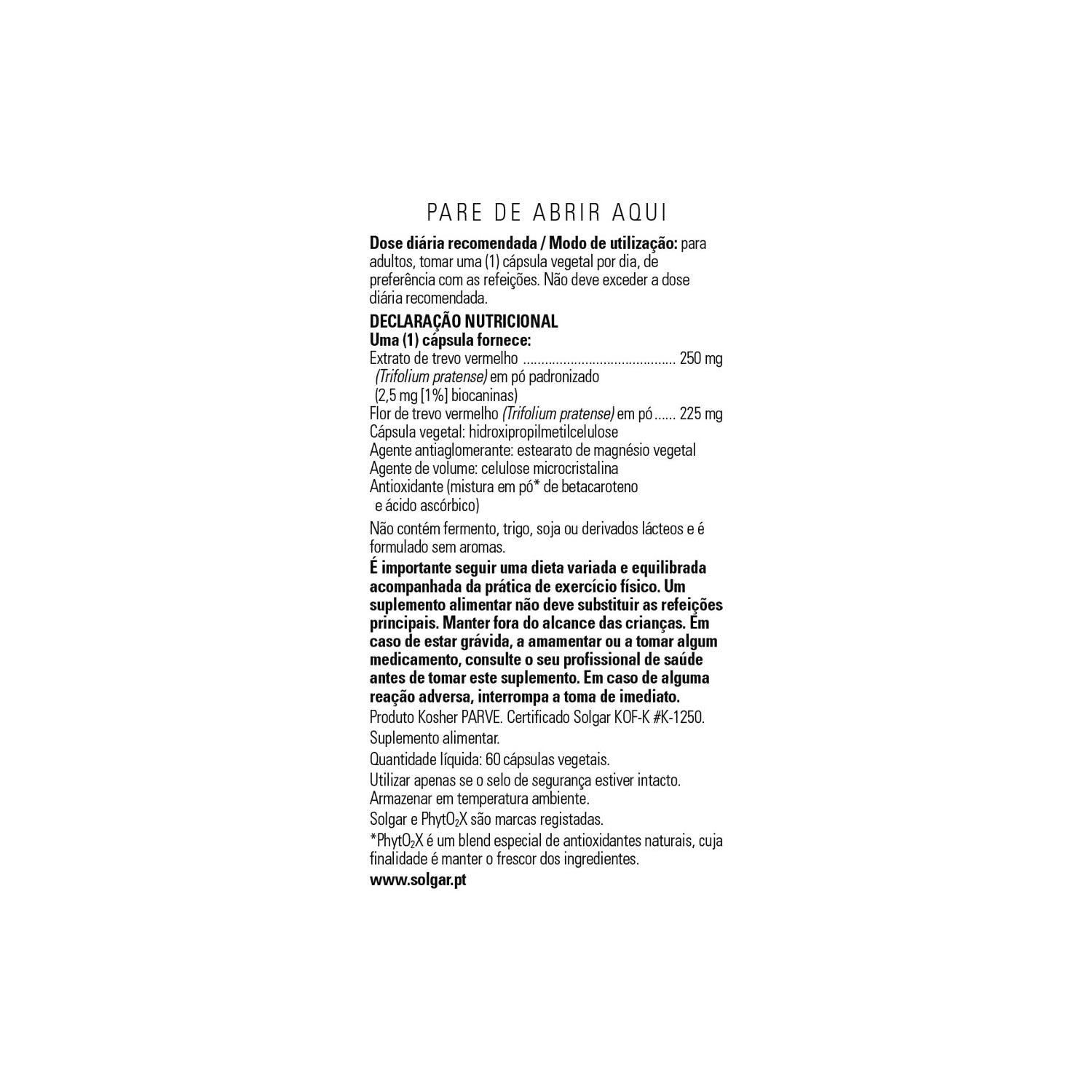 Complément alimentaire végétal à base d'extrait de feuilles et de fleurs de trèfle rouge (Trifolium Pratense) appartenant à la famille des légumineuses, qui produit des effets semblables à ceux des œstrogènes, grâce à son contenu phytochimique, ce qui peut aider les femmes dans le processus de la ménopause. Il ne contient ni sel, ni sucre, ni amidon. Il convient aux régimes végétariens et végétaliens.