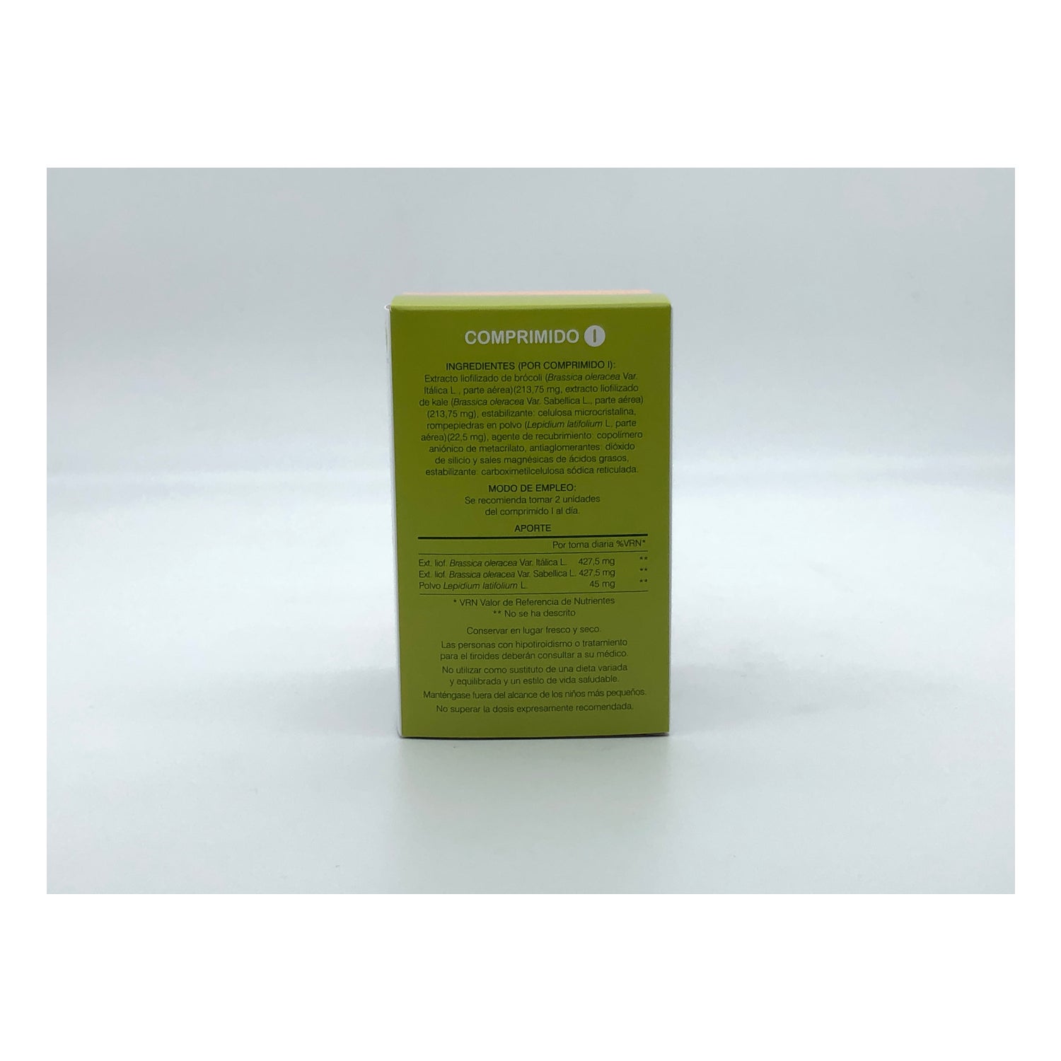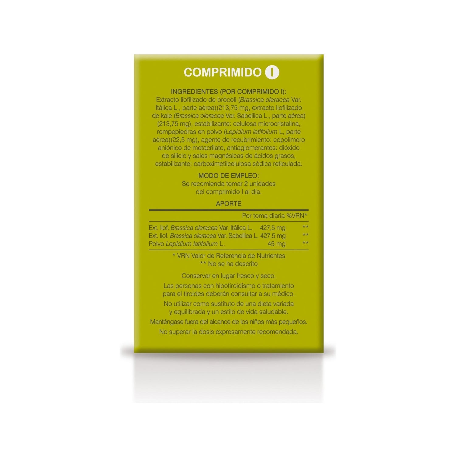 Comprimé 1 : Extrait lyophilisé de brocoli (Brassica Oleracea Var. Italica L., partie aérienne) (213,75 mg), Extrait lyophilisé de chou frisé (Brassica Oleracea Var. Sabellica L., Partie aérienne) (213,75 mg), stabilisateur (cellulose microcristalline), poudre de casse-pierre (Lepidium Latifolium L, partie aérienne) (822,5 mg), agent d'enrobage (copolymère méthacrylate anionique), anti-agglomérants (dioxyde de silicium et sels de magnésium d'acides gras), stabilisateur (carboxyméthylcellulose sodique réticulée).