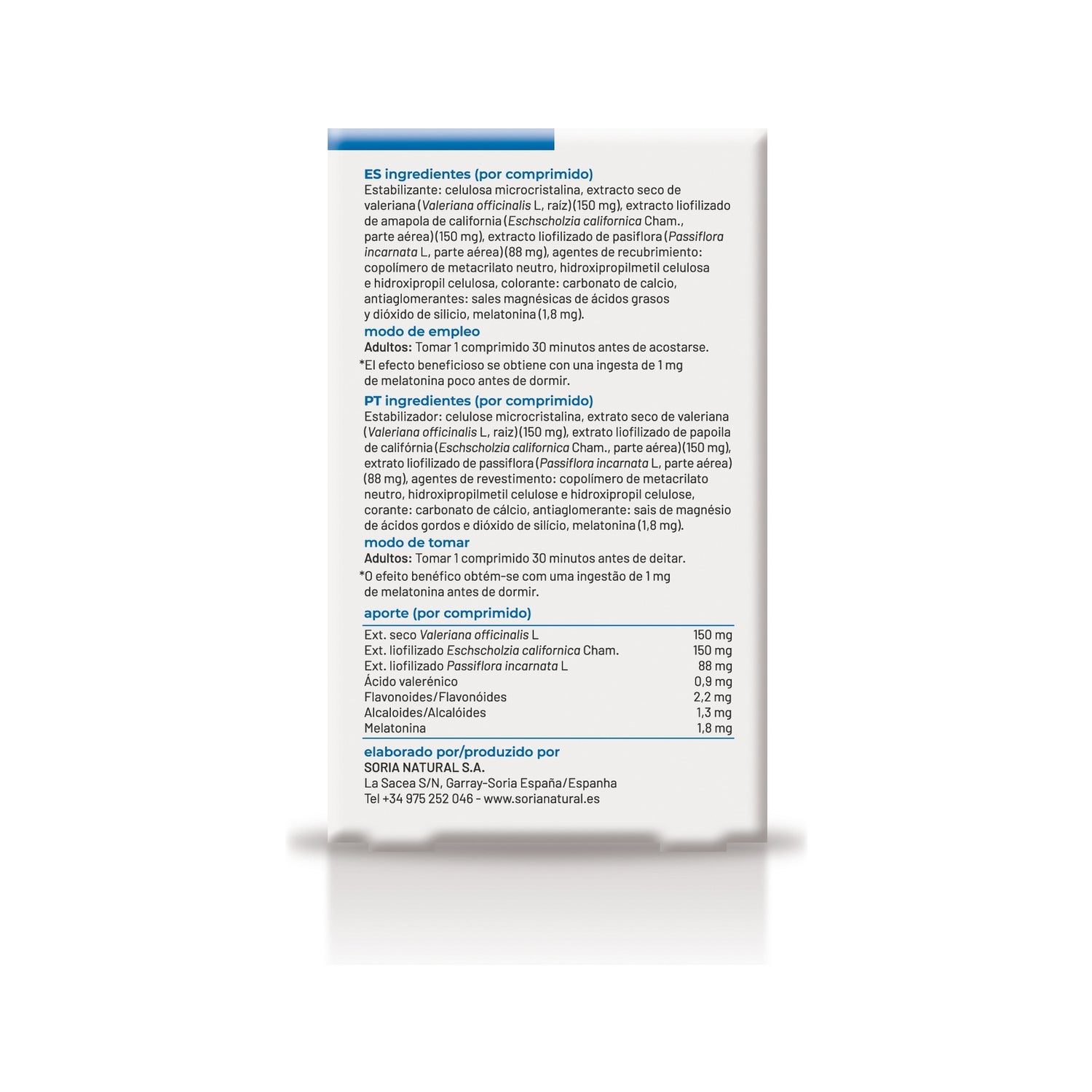 Extrait lyophilisé valeriana officinalis L (150 mg), Extrait lyophilisé eschscholtzia californica cham (150 mg), Extrait lyophilisé passiflora incarnata L (75 mg), Flavonoïdes (2,2 mg), Mélatonine (1,8 mg), Alcaloïdes (1,3 mg), Acide valérénique (0,9 mg).