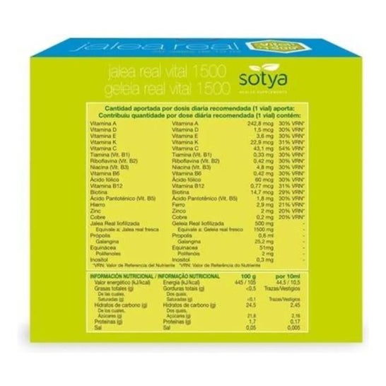 Sotya Jalea Real Vital 1500 20 ampoules complément alimentaire formulé à base de gelée royale fraîche, d'inuline, de fructose et d'arôme d'orange cette composition permet de stimuler l'organisme à différents niveaux, d'augmenter les capacités physiques et intellectuelles, de favoriser les processus d'anémie, d'améliorer les défenses contre les attaques virales et bactériennes, mais aussi d'améliorer les troubles de l'humeur émotionnelle et d'apathie
