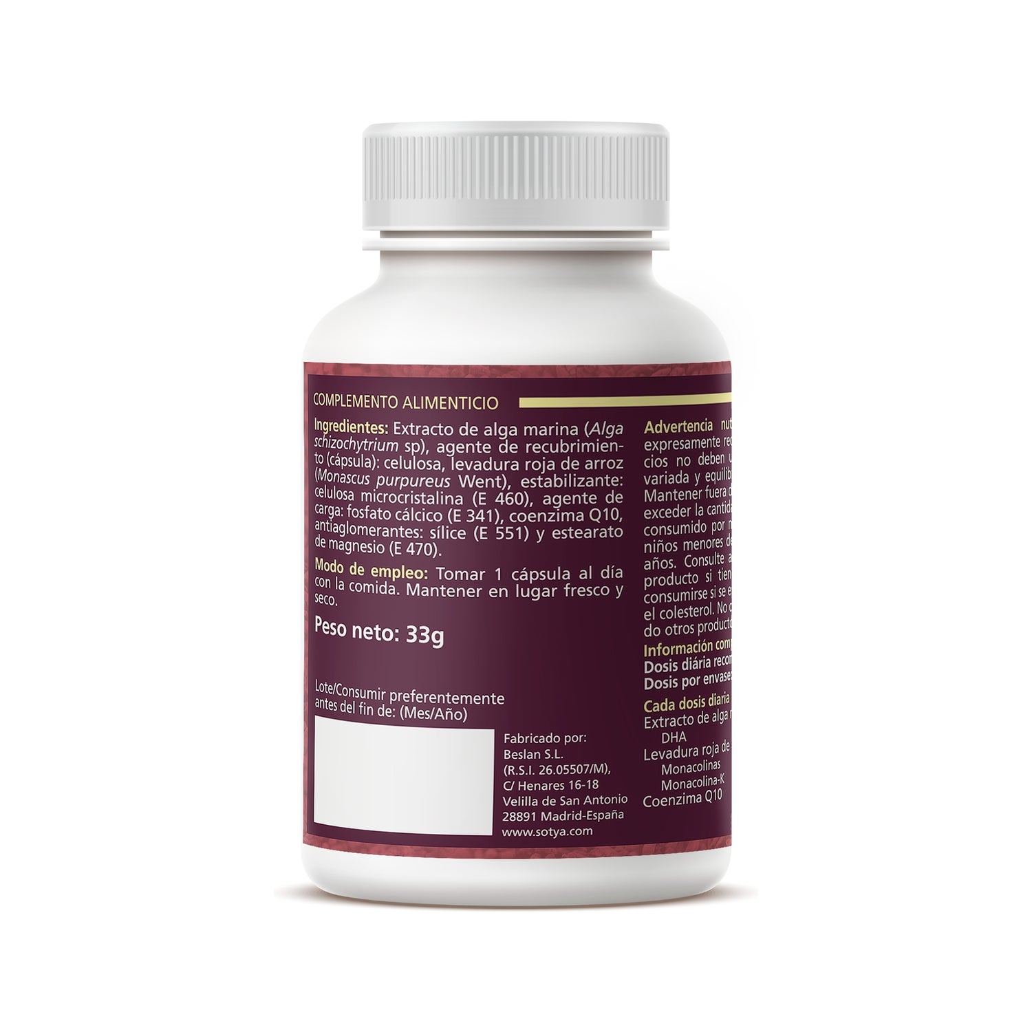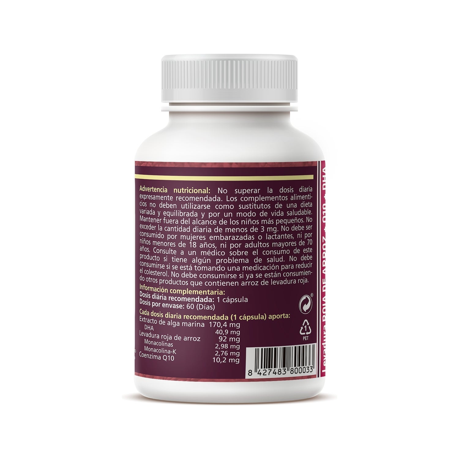 Complément alimentaire à base de levure de riz rouge, contenant des composés dont des polycyclides, des acides gras insaturés, des pigments, des phytostérols et des monacolines. Aide à réduire et à maintenir le taux de cholestérol et favorise la circulation sanguine. Il contient également de la coenzyme Q10 qui agit comme un antioxydant qui aide au métabolisme des aliments et à leur conversion en énergie.