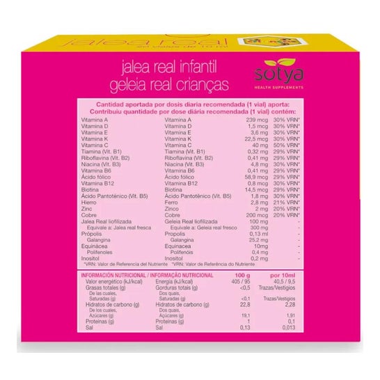 Complément alimentaire à base de gelée royale pour enfants qui aide à renforcer le système immunitaire responsable des défenses. Il contient des ingrédients tels que la vitamine A, B6, C, le zinc et le fer. En outre, il contient de la vitamine C, essentielle pour prévenir l'épuisement et la fatigue. Format tonique, 20 ampoules de 10ml.