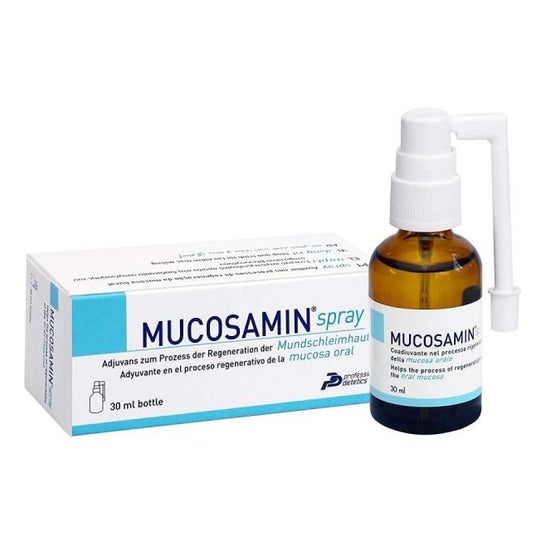 Spray de Mucosamine de 30ml est un spray adjuvant pour la régénération de la muqueuse buccale. Il contient acide hyaluronique et acides aminés qui favorisent l'action du collagène.