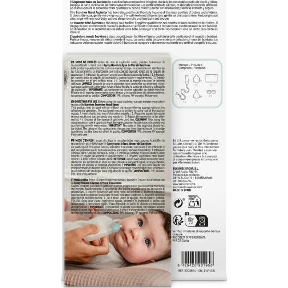 Suavinex Aspirateur Nasal +0 Mois est un dispositif conçu pour faciliter le nettoyage quotidien des fosses nasales. Cet aspirateur est particulièrement utile dans le soin des plus petits, car il aide à prévenir l'obstruction nasale chez les enfants qui n'ont pas encore appris à se moucher eux-mêmes.