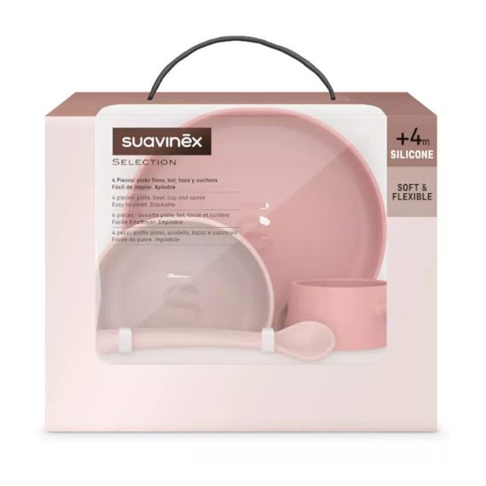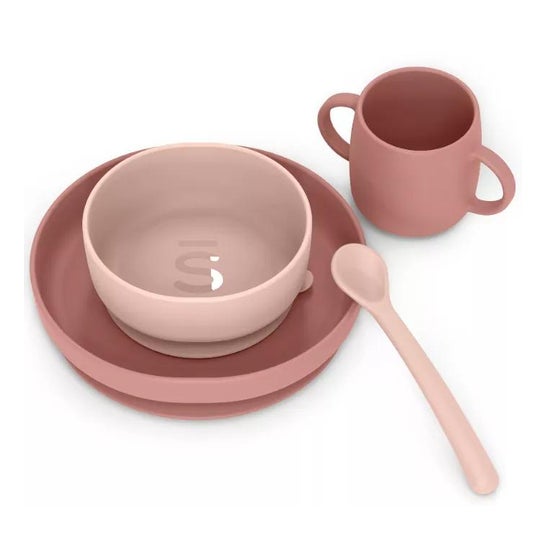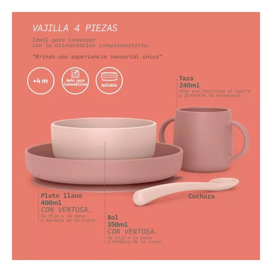 Vaisselle pour enfants en silicone de qualité alimentaire et pigments alimentaires, comprenant une assiette, un bol et une cuillère. Elle est conçue pour faciliter la transition vers une alimentation solide pour les petits. La vaisselle est robuste, facile à nettoyer et sûre pour les bébés à partir de 6 mois.