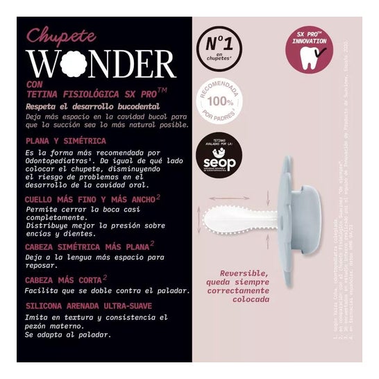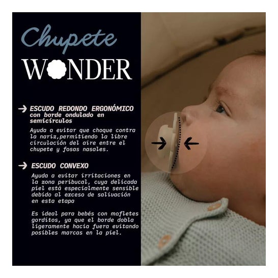 Placer sur les lèvres du bébé en pressant doucement, jusqu'à ce qu'il reconnaisse la forme et s'adapte à son palais. Nettoyer et laver après chaque utilisation. Idéal pour dormir, de manière symétrique. Avec un col plus fin qui permet au bébé de fermer la bouche presque complètement.