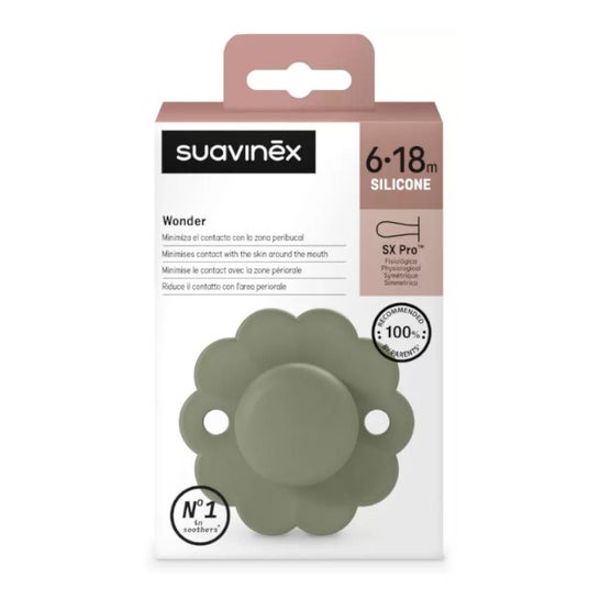 La sucette Suavinex Wonder SX Pro en silicone, modèle Hedge Green, 6-18M, est une sucette qui respecte le développement bucco-dentaire du bébé. Elle est fabriquée avec une tétine physiologique SX Pro en silicone ultra-douce sablée qui imite en texture et en consistance le mamelon maternel. De plus, elle possède un bouclier rond ergonomique et convexe qui permet la circulation de l'air entre la sucette et les narines. Sucette pour les bébés de 6 à 18 mois.