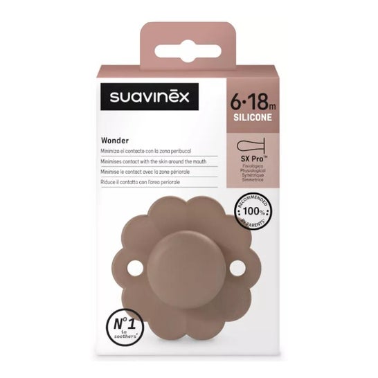 La sucette Suavinex Wonder SX Pro en silicone couleur Raw Umber 6-18M 1ud est une tétine qui respecte le développement bucco-dentaire du bébé. Elle est fabriquée avec une tétine physiologique SX Pro en silicone ultra-douce qui imite la texture et la consistance du mamelon maternel. De plus, elle possède un bouclier rond ergonomique et convexe qui permet la circulation de l'air entre la sucette et les narines. Sucette pour bébés de 6 à 18 mois.