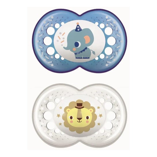Sucette pour bébés de plus de 16 mois, fabriquée avec une tétine en silicone spécialement développée pour réduire le risque de malpositions dentaires, aidant à avoir des dents saines et un développement correct de la mâchoire.