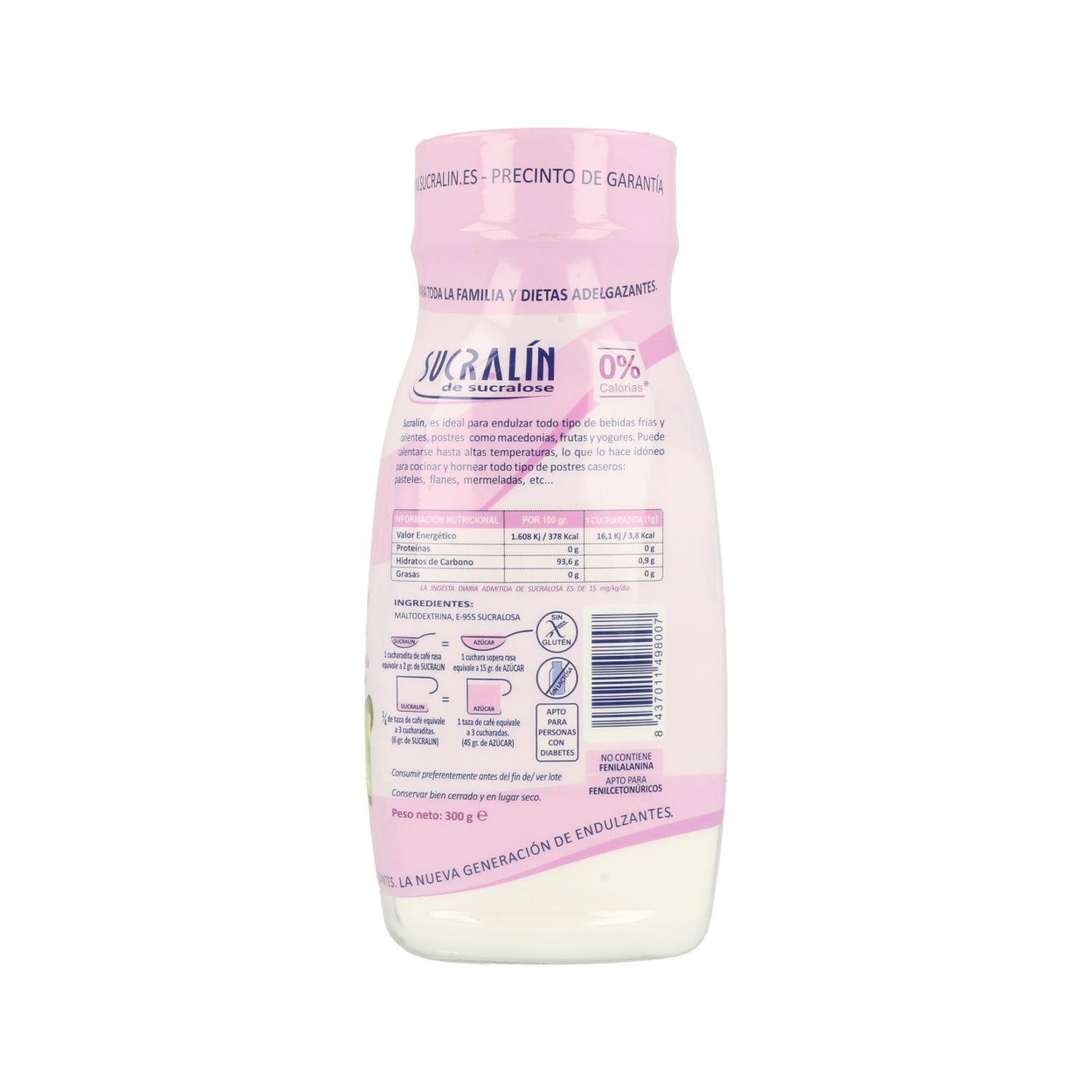 La sucraline est un édulcorant qui provient du sucre mais qui ne fournit pas de calories à l'organisme. C'est pourquoi c'est un édulcorant optimal pour les personnes qui suivent un régime amaigrissant, ainsi que pour la cuisine sans sucre.