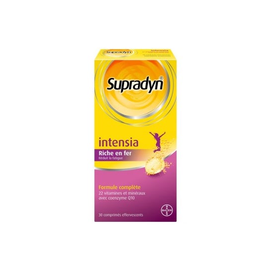 Supradyn Intensia Riche En Fer 30 Comprimés Effervescents est un complément alimentaire à la formule complète qui contient 22 vitamines et minéraux avec de la coenzyme Q10, riche en fer, afin de réduire la fatigue.