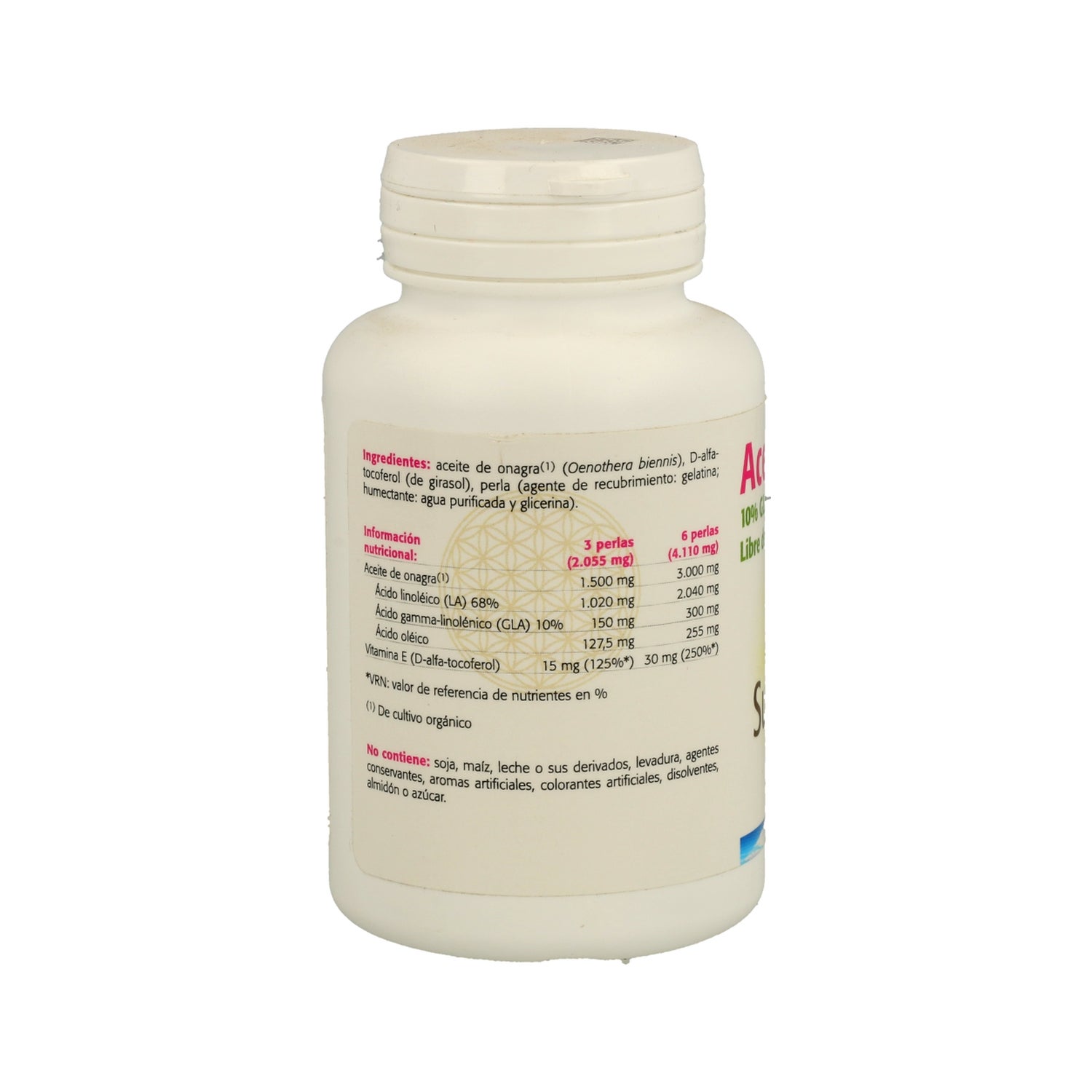 Complément alimentaire qui aide à agir comme un anti-inflammatoire, régule le système immunitaire en activant les lymphocytes T et aussi la régulation hormonale cher les femmes, a un effet sur la santé cardiovasculaire en inhibant l'agrégation des plaquettes et en prévenant la thrombose, et a un effet vasodilatateur en inhibant la synthèse du cholestérol. Contient des graines d'onagre suivant un processus de première pression à froid sans utilisation de solvants, garantissant un minimum de 10% d'acide gamma-linolénique (GLA). Format de 90 perles.