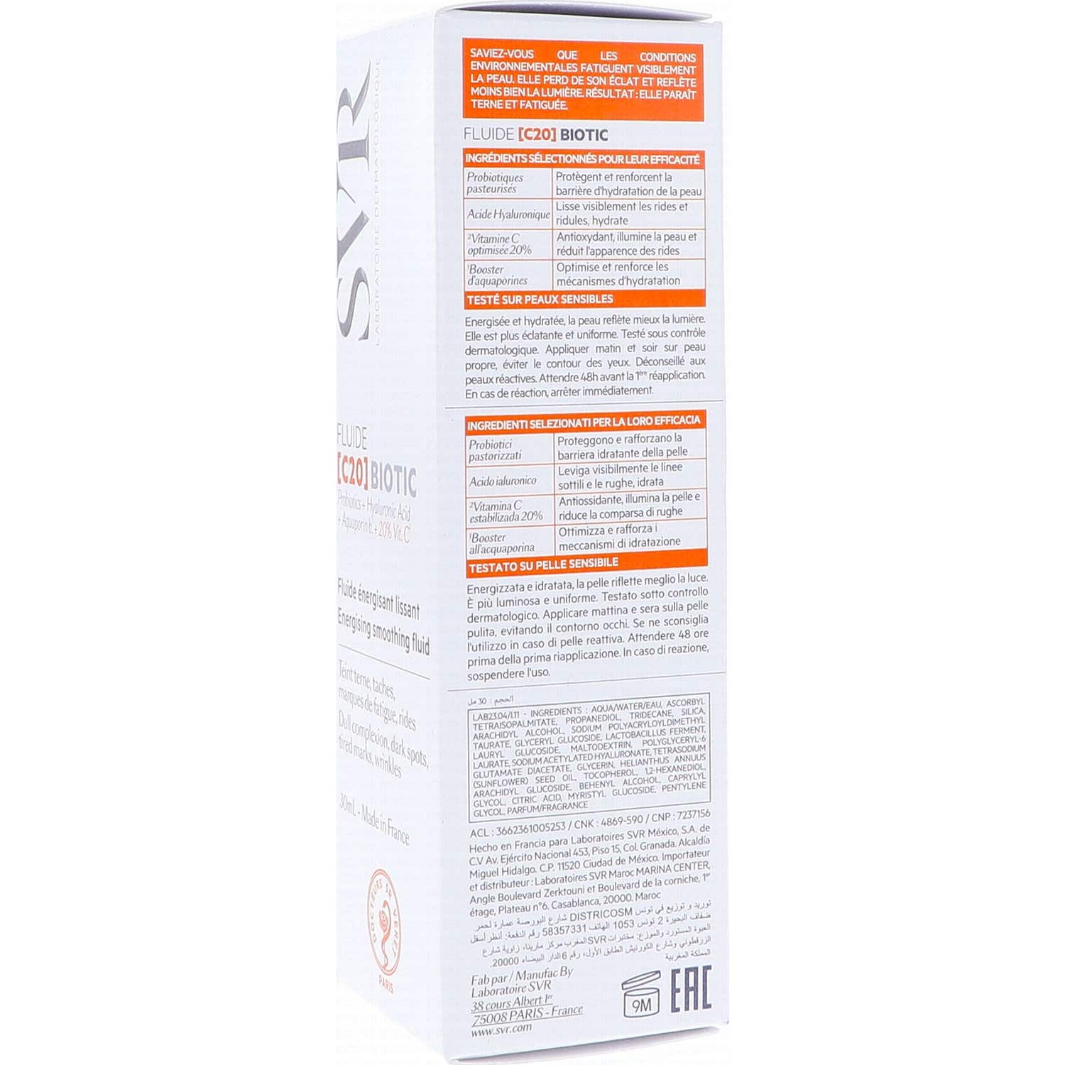 Svr Fluide [C20] Biotic Fluide Énergisant Adoucissant est un traitement facial conçu pour revitaliser la peau présentant des signes de fatigue et de manque d'uniformité. Ce fluide contient un 20% de vitamine C optimisée, un puissant antioxydant qui aide à combattre les radicaux libres, améliorant ainsi le teint et la luminosité de la peau. Sa formulation offre un effet immédiat de douceur et de fraîcheur, laissant un fini velouté.