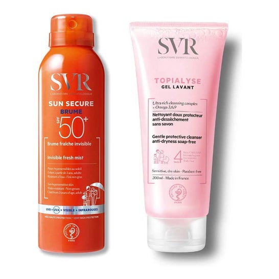 SVR Sun Secure Brume SPF50+ 200ml + Topialyse Gel Lavant 200ml est composé de 2 soins corporels, contribuant à protéger la peau de l'action nocive des rayons du soleil, ainsi qu'à la régénérer après une exposition au soleil.