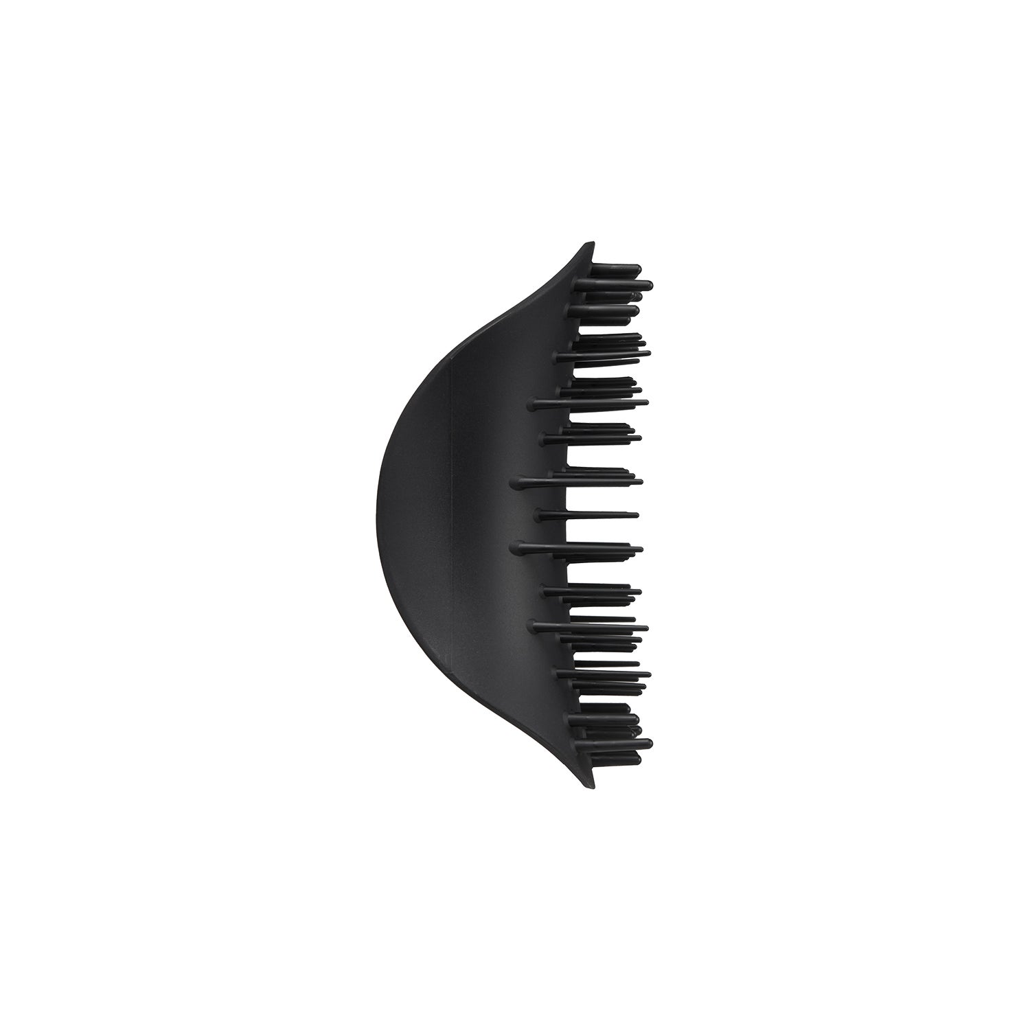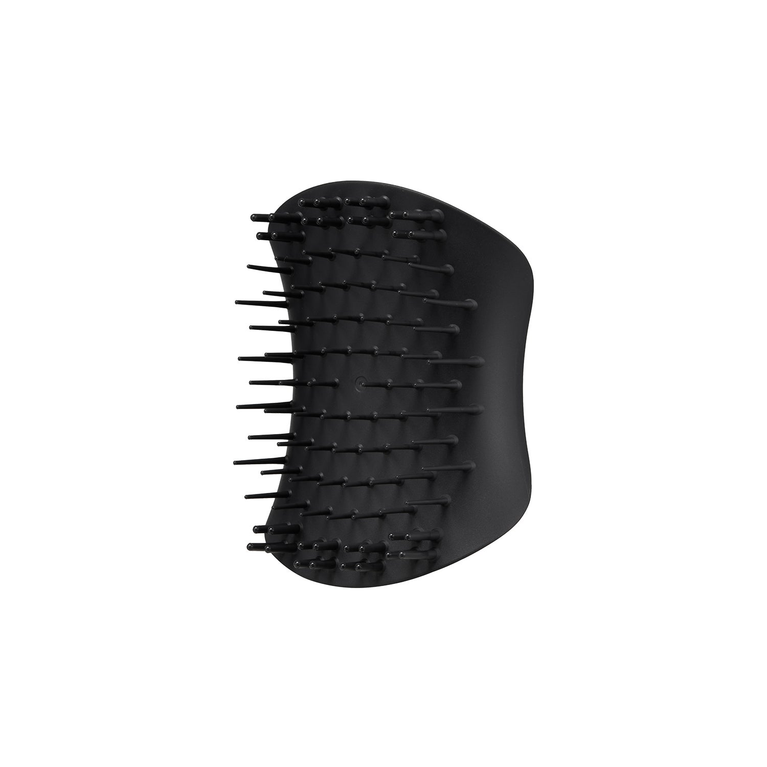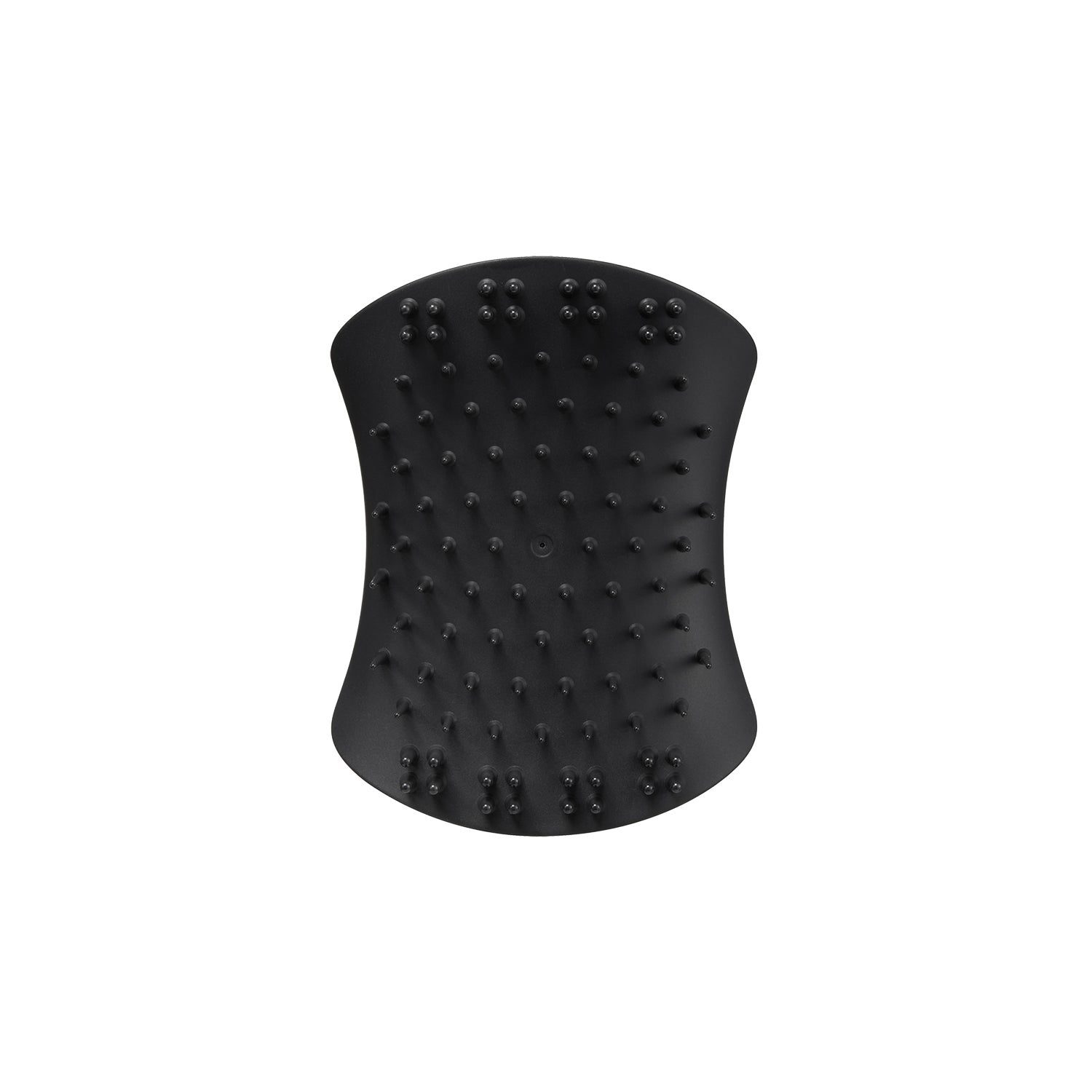 Brosse de massage pour cheveux de couleur noir onyx. Indiqué pour l'exfoliation du cuir chevelu, il possède de longues dents très souples, qui contribuent à l'élimination et au renouvellement des cellules mortes. Il en a d'autres sur le bord, qui sont courts et plus fermes, qui stimulent et massent les points de pression. La poignée est parfaitement adaptée à la paume de la main, ce qui évite tout glissement et facilite l'utilisation.