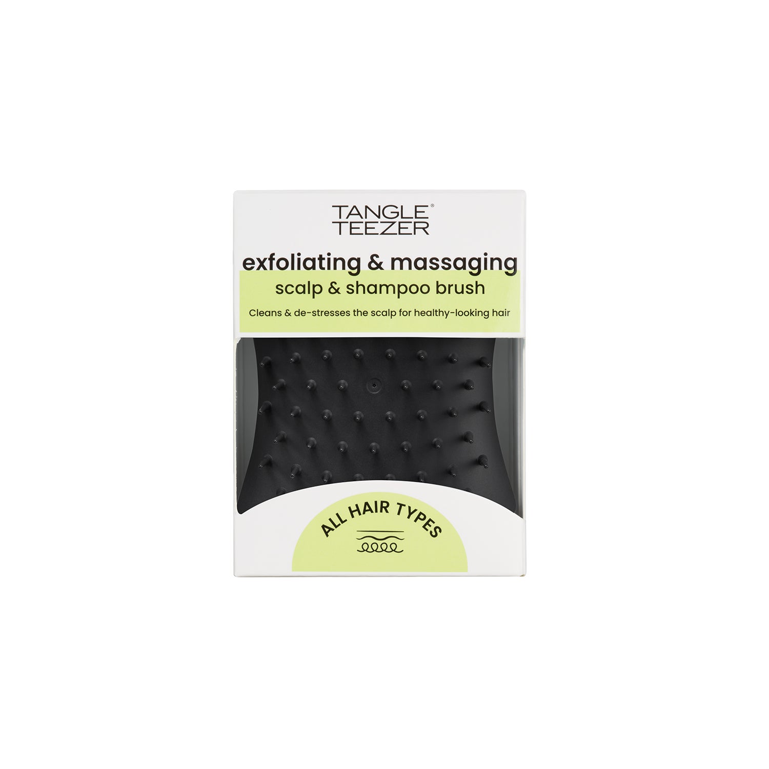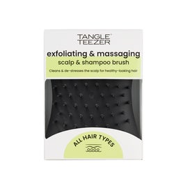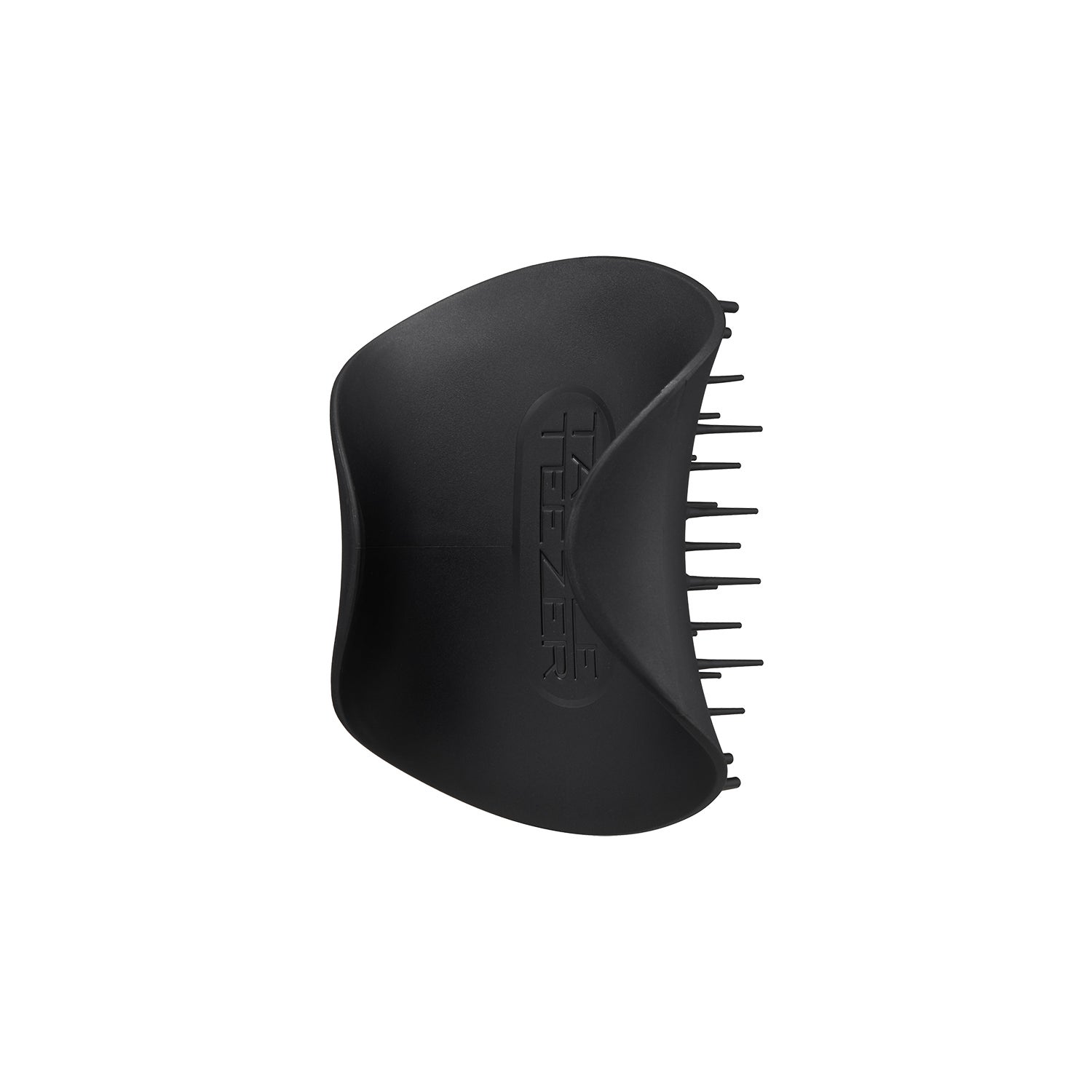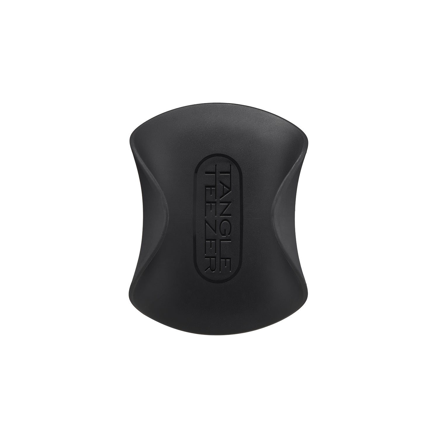 Brosse de massage pour cheveux de couleur noir onyx. Indiqué pour l'exfoliation du cuir chevelu, il possède de longues dents très souples, qui contribuent à l'élimination et au renouvellement des cellules mortes. Il en a d'autres sur le bord, qui sont courts et plus fermes, qui stimulent et massent les points de pression. La poignée est parfaitement adaptée à la paume de la main, ce qui évite tout glissement et facilite l'utilisation.