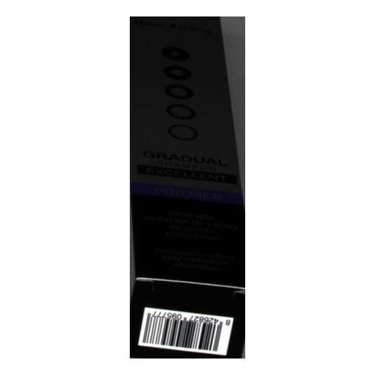 Shampooing pour hommes avec effet de réduction des cheveux gris. Formule à pH neutre. Aide à réduire progressivement les cheveux blancs à chaque application tout en hydratant et en soignant les cheveux. Ses composants exercent une action subtile, discrète et naturelle qui améliore son efficacité à chaque utilisation. Emballé dans un tube en aluminium 100% recyclable. Convient à un usage fréquent par des personnes âgées de plus de 18 ans.