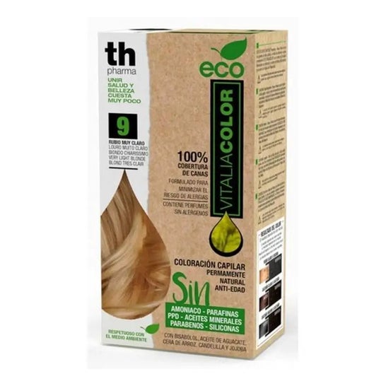 Th Pharma Vitalia Color Eco n°9 Very Light Blonde est une teinture pour cheveux sans ammoniaque, enrichie d'huiles florales et d'or liquide. Il a une formule délicate qui ne contient pas de produits chimiques, donc il agit de manière douce et non agressive. En outre, il ne contient pas d'ammoniac, de paraffine, d'huiles minérales, de parabènes ou de silicones, ce qui lui confère une grande tolérance.