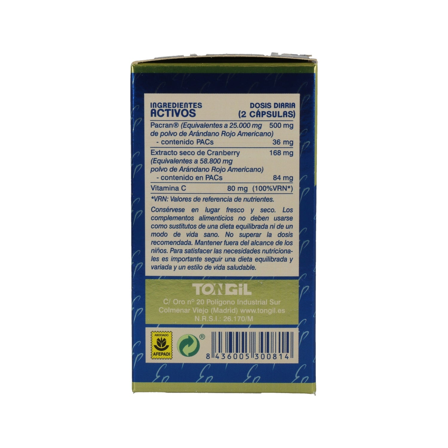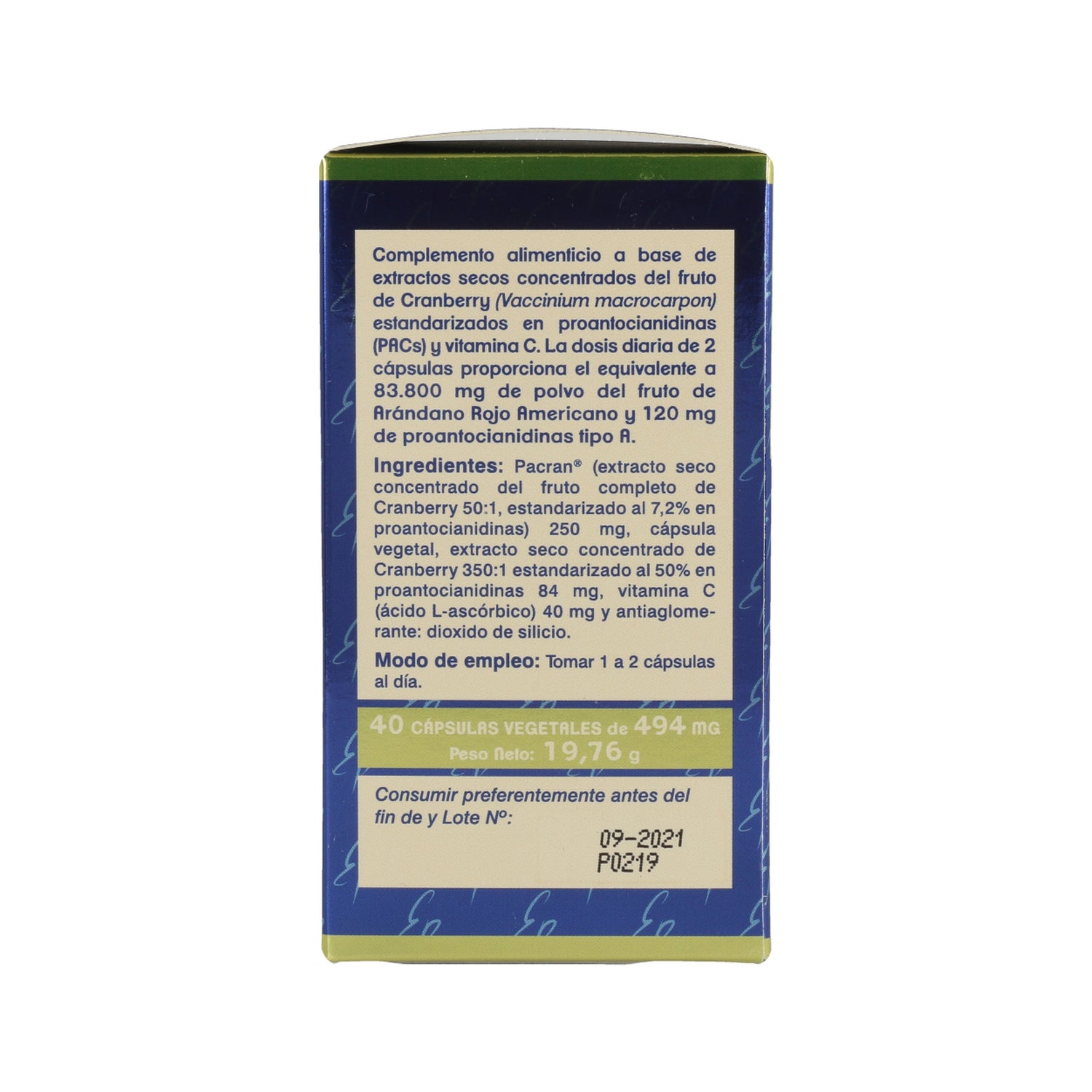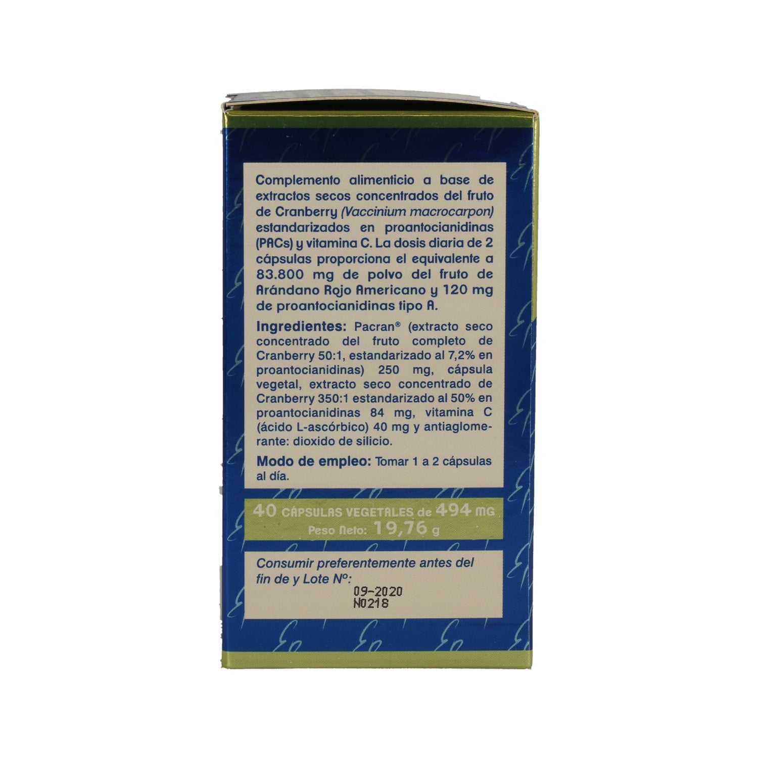 Complément alimentaire sous forme de gélules spécialement conçu pour aider à maintenir la santé des voies urinaires, en soulageant les symptômes de la cystite, grâce à son composé élaboré à partir de canneberge américaine et à ses substances anti-adhésives appelées proanthocyanidines, qui empêchent les bactéries responsables de la cystite d'adhérer aux voies urinaires, en particulier la bactérie Eschericia coli.