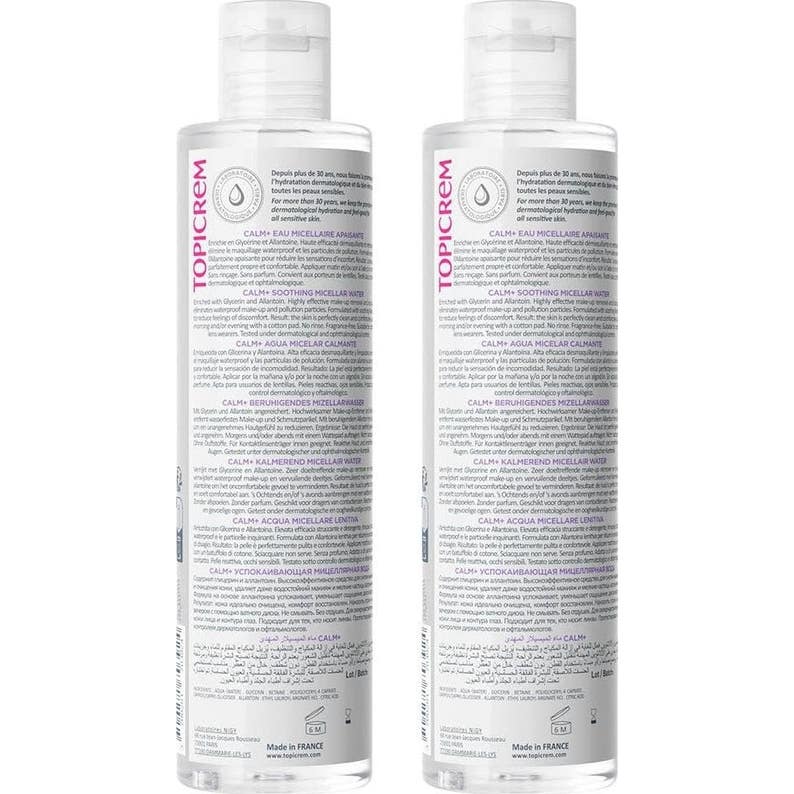 Topicrem Calm Eau Micellaire Apaisante Pack 2x200 ml est un produit conçu pour le nettoyage et le démaquillage des peaux intolérantes et des yeux sensibles. Cette eau micellaire est formulée avec des micelles d'origine naturelle, ce qui lui confère une efficacité notable pour éliminer :