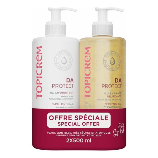 Topicrem DA Protect Pack Baume 500 ml + Huile de Douche 500 ml est un ensemble de produits conçu pour offrir une attention intégrale aux peaux sensibles, très sèches et atopiques. Ce pack est adapté aux adultes, enfants et bébés à partir de 3 mois, et fournit une solution complète pour le nettoyage, l'hydratation et le soulagement de la peau sujette aux irritations.