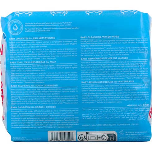 Les lingettes sont imprégnées d'eau pure, ce qui permet un nettoyage doux. Sa formulation sans parfum aide à réduire le risque d'irritations et d'allergies, étant idéales pour la peau délicate du bébé. Le tissu doux des lingettes facilite un nettoyage efficace de :