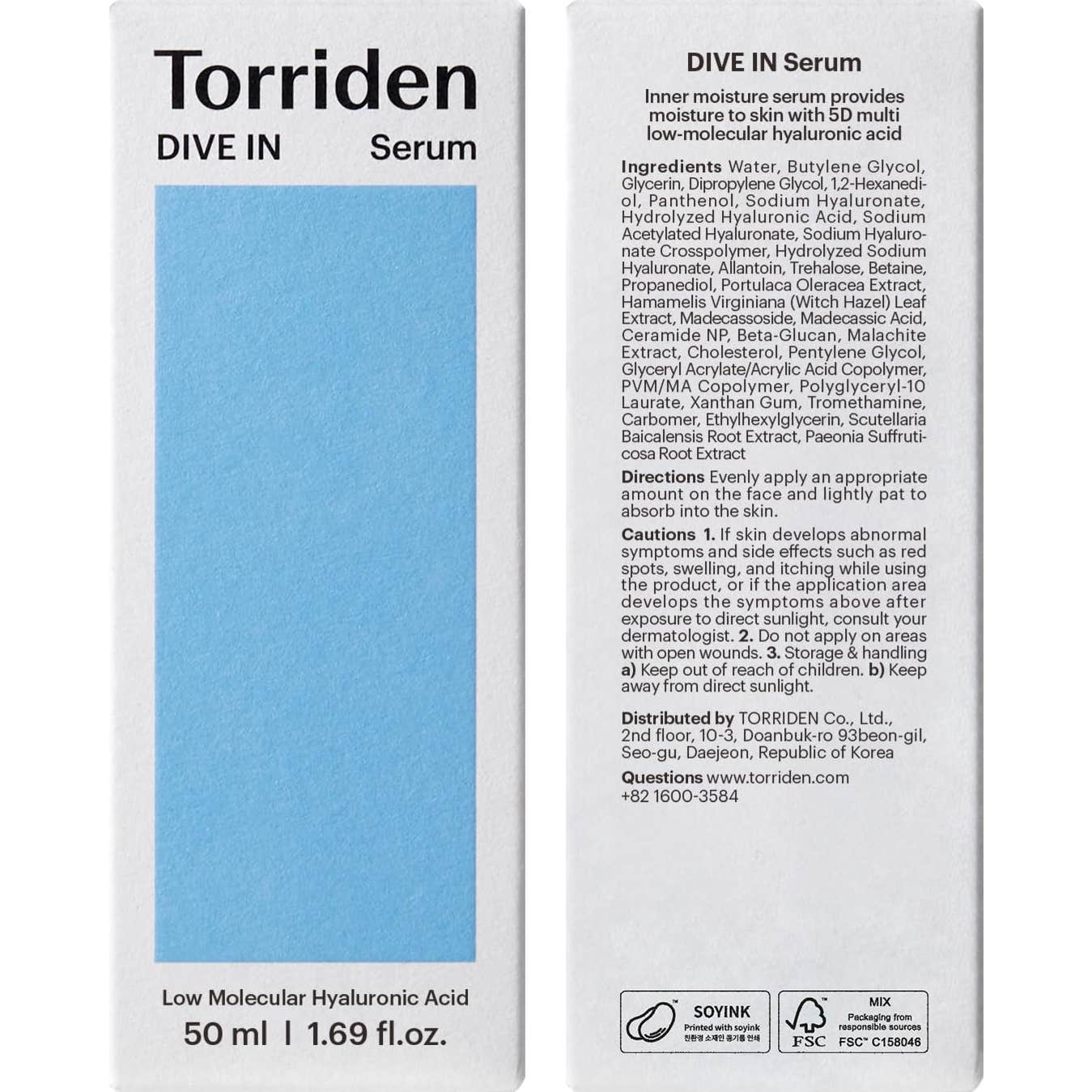 Sérum Acide Hyaluronique Torriden Dive-In 50 ml est un sérum hautement concentré qui s'absorbe rapidement, offrant une hydratation intense et en profondeur. Sa formule contient un complexe de cinq types de d'acides hyaluroniques à faible poids moléculaire qui ont la capacité de cibler et d'hydrater toutes les couches de l'épiderme. Cela contribue à renforcer la barrière protectrice de la peau et à garantir une hydratation prolongée. Il est adapté à tous les types de peau, y compris les plus sensibles.