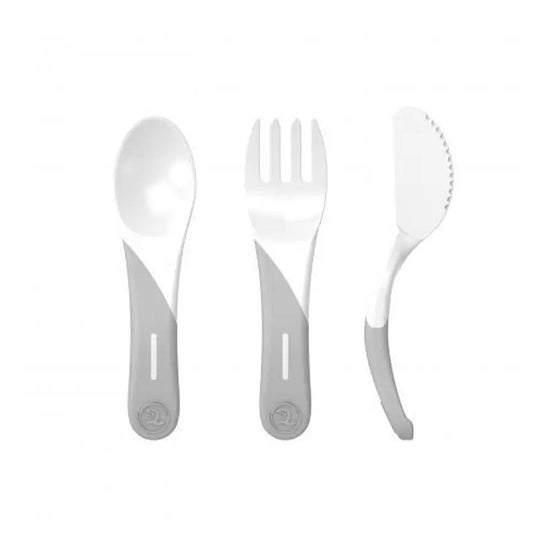 Ensemble de couverts d'apprentissage comprenant une cuillère, un couteau et une fourchette en blanc pour aider au processus de développement de l'alimentation jusqu'à ce que les enfants apprennent à manger seuls. Elles sont fabriquées dans un matériau doux et facile à prendre en main, qui empêche les mains de glisser. Conçu avec une poignée très courte pour tenir dans la main de bébé. Idéal pour les enfants à partir de 6 mois.