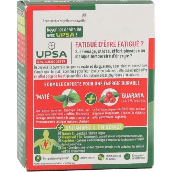 UPSA Énergie Booster Maté est un complément alimentaire effervescent au goût citron-maté, formulé pour offrir un coup de fouet physique et mental durant la journée.