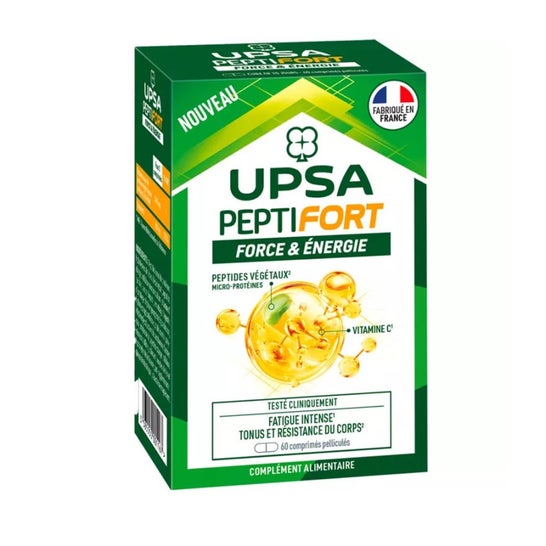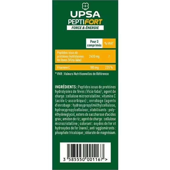 Upsa Peptifort Force et Énergie est un complément alimentaire conçu pour les adultes, qui combine des peptides dérivés des fèves et de la vitamine C. Ce produit se présente comme une solution innovante pour ceux qui éprouvent une fatigue intense.