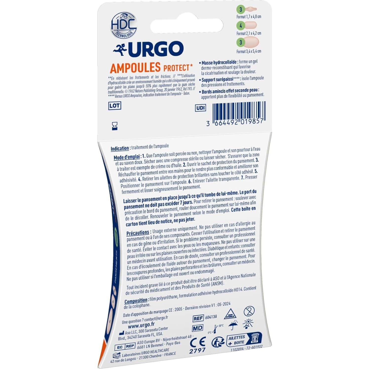 Il est essentiel de suivre les instructions incluses dans l'emballage pour garantir une utilisation correcte et un renouvellement du pansement selon les besoins. La composition d'Urgo Ampoules Protect comprend un film en polyuréthane et une formulation adhésive hydrocolloïde, qui contient de la colophane.