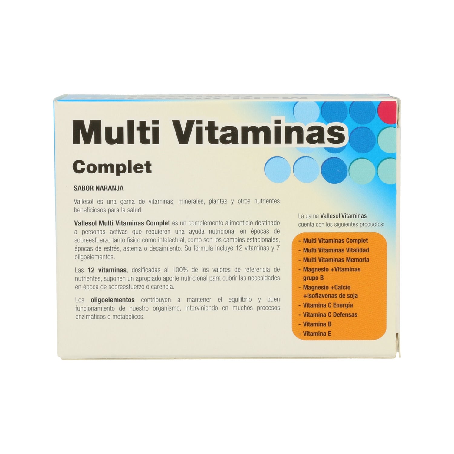 Vallesol Multivitamines Complet + Oligo-éléments est un complément alimentaire puissant conçu pour renforcer l'organisme en période de forte usure physique et intellectuelle, comme les changements saisonniers, les périodes de stress, d'asthénie ou de carie. Ce produit à haute énergie contient 12 vitamines et 7 oligo-éléments.