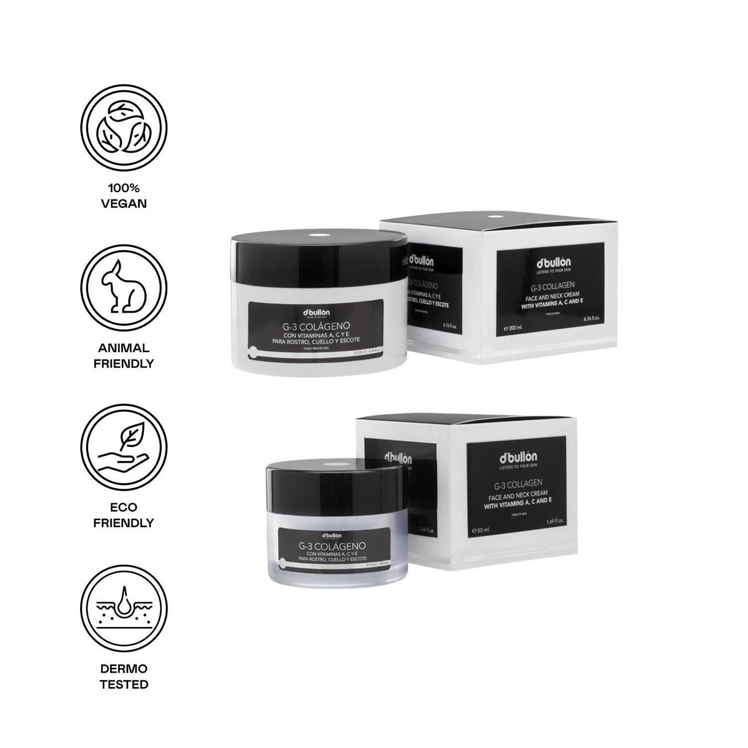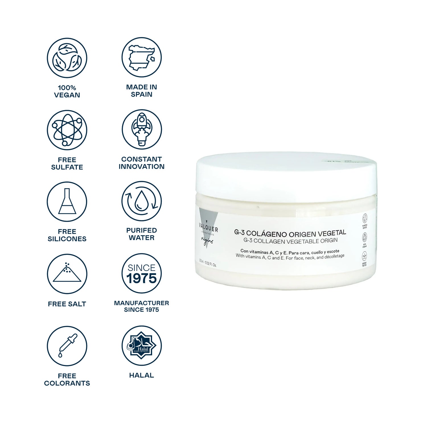 Crème faciale G-3 Collagène d'origine végétale formulée avec des vitamines A, C et E pour le visage, le cou et le décolleté.