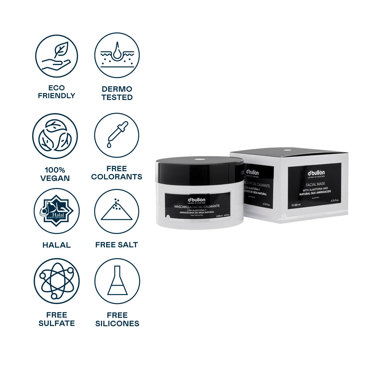 Masque facial apaisant avec Allantoïne et acides aminés de soie naturelle. Léger et frais avec un effet apaisant (Allantoïne), relaxant et hautement hydratant, grâce aux acides aminés de soie 100% naturelle qu'il contient, nous vous présentons ce masque facial de la marque Válquer, qui élimine les impuretés, décongestionne la peau et procure une excellente douceur et texture.