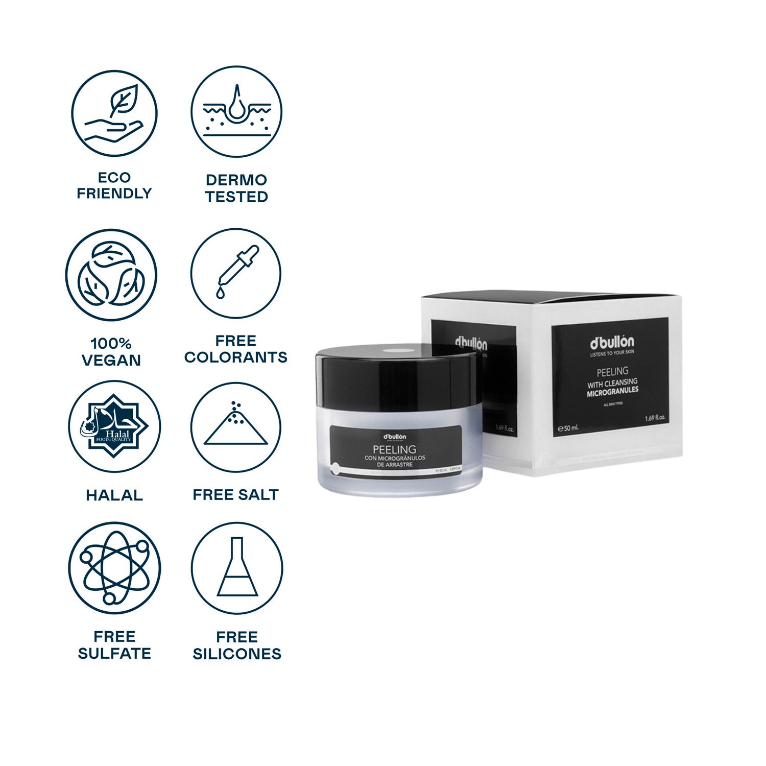 Il a été formulé avec acide polylactique, des microparticules biodégradables provenant de sucres végétaux dont la fonction principale est l'exfoliation. Il est très doux, végan et possède la certification Halal.