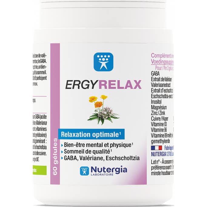 -14% Nutergia Ergyrelax 60 Gélules 16,90 € 14,49 € Nutergia Ergyrelax 60 Gélules est un complément alimentaire à base de GABA, plantes et vitamines B qui favorisent une relaxation optimale.Sa formule contient une synergie à base de valériane, d’eschscholtzia et d’un neurotransmetteur, le GABA. Voir détail