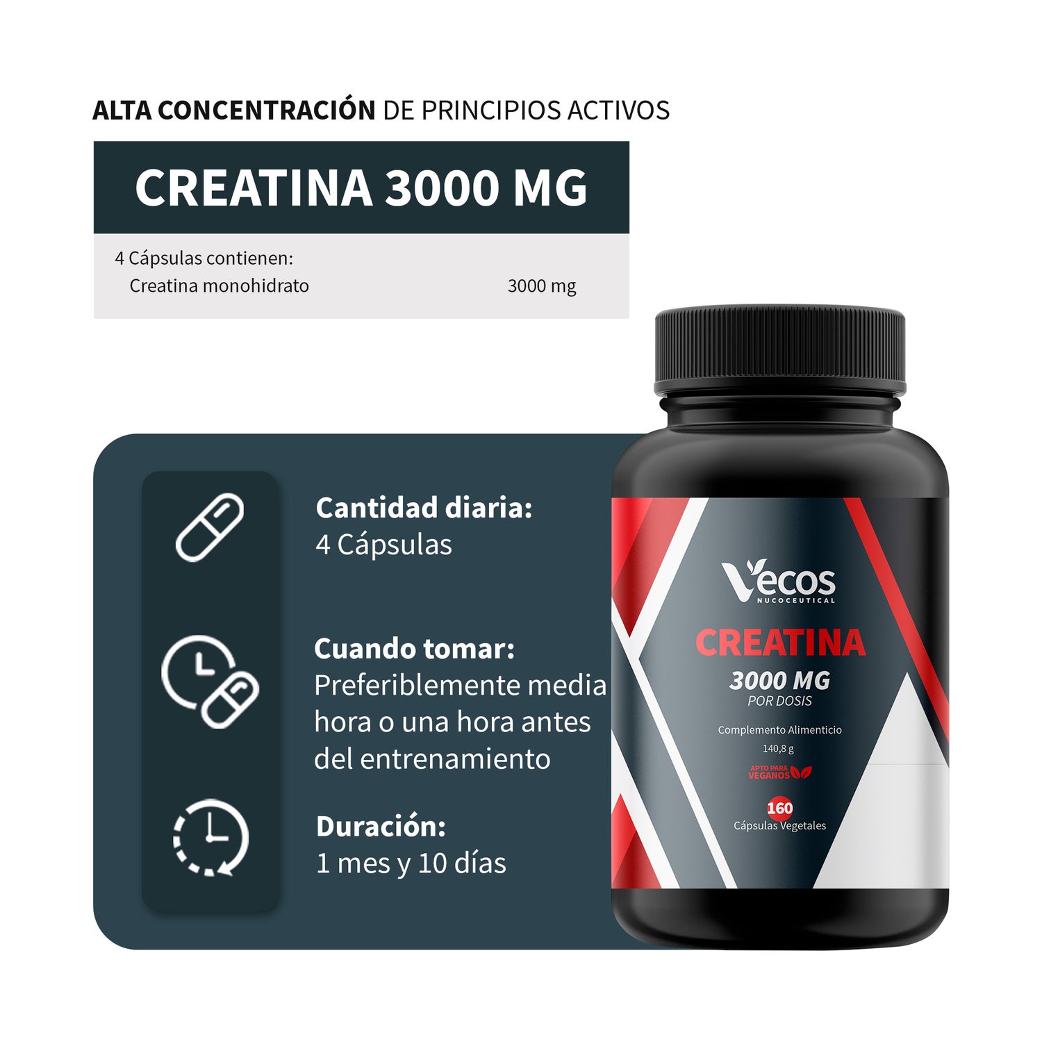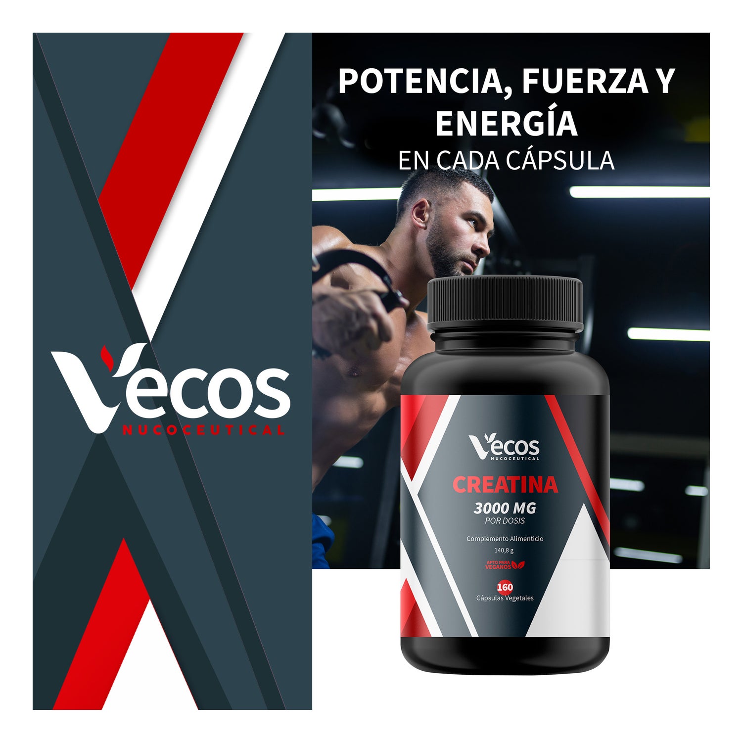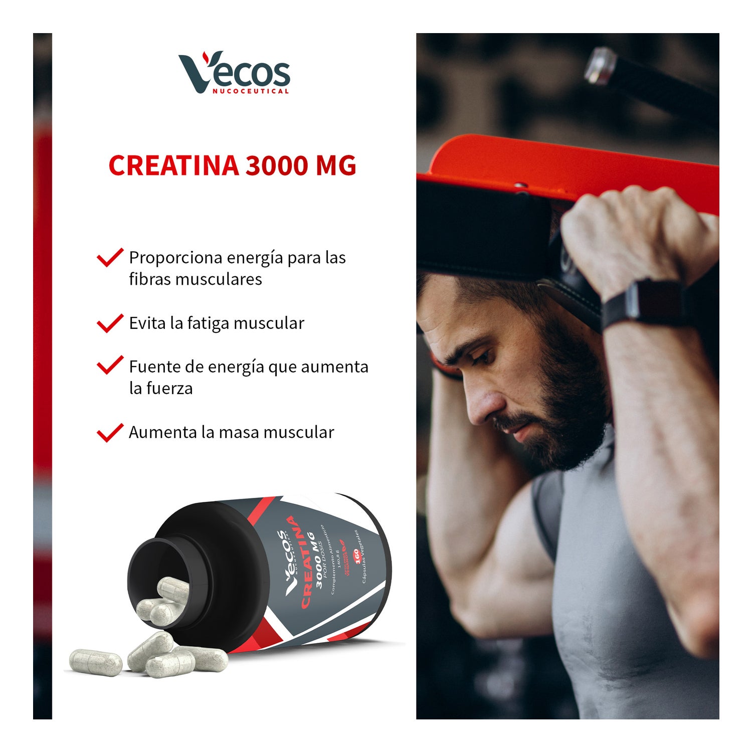 Vecos Nucoceuticals Créatine 3000mg 160caps est un complément alimentaire formulé avec créatine en capsules végétales.