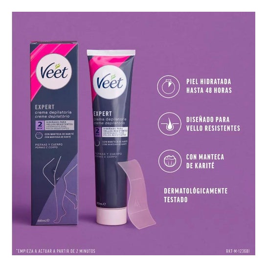 Veet Expert Crème Dépilatoire Jambes et Corps 200ml est une crème dépilatoire destinée à l'épilation des jambes et du corps, formulée à base de beurre de karité et enrichie en agents hydratants naturels. Elle est efficace après 2 minutes et maintient la peau hydratée pendant 48 heures. Cette crème tolère tous les types de peau, même les peaux sensibles, car elle est testée dermatologiquement.