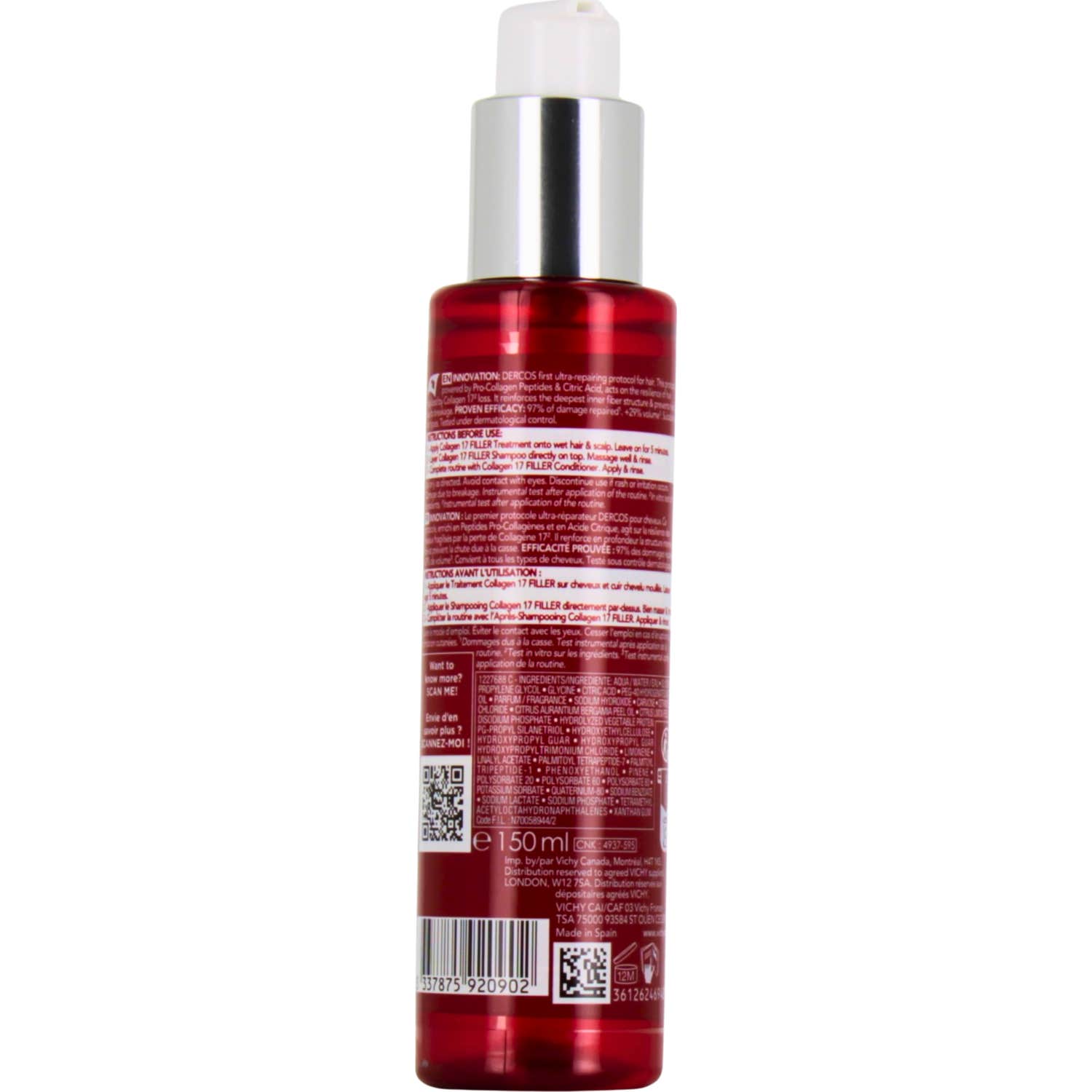 Vichy Dercos Collagen Filler 17 Pre Shampoo est un produit conçu pour renforcer la structure interne des cheveux et réduire la fragilité. Ce pré-shampooing ultra-réparateur, de 150 ml, fait partie de la gamme DERCOS Collagen 17 Filler, qui propose un protocole spécifique pour lutter contre les dommages capillaires.
