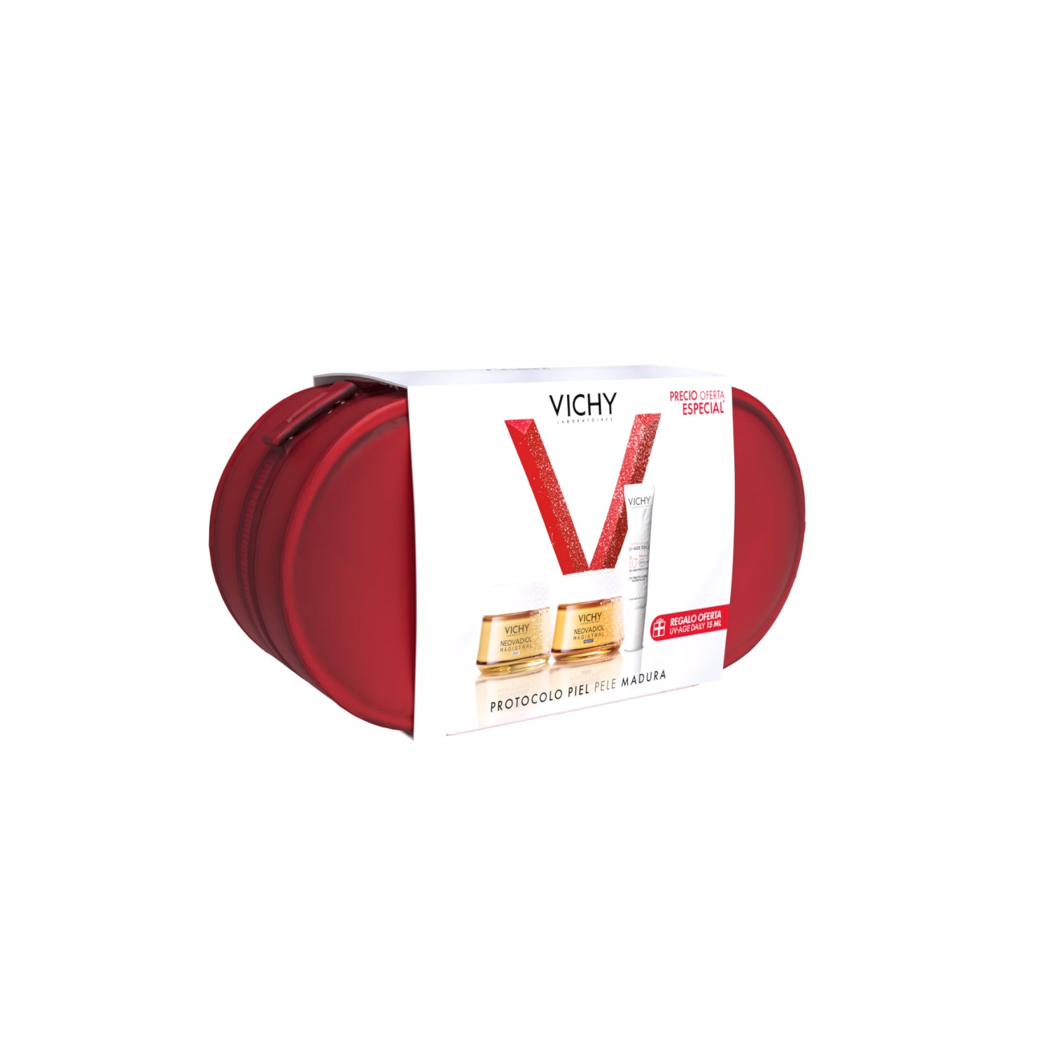 Vichy Pack Necessaire Protocole Peau Mûre 50ml + 50ml + 15ml est un ensemble conçu pour répondre aux besoins spécifiques de la peau mature, en particulier pendant et après la ménopause. Ce pack comprend trois produits essentiels :