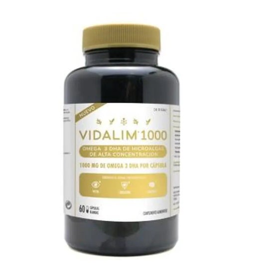 Vidalim 1000mg DHA 60caps est un complément alimentaire qui contient des acides gras Omega 3 DHA dérivés de microalgues, ainsi que de la vitamine E, en capsules de gélatine bovine. Chaque capsule fournit 1000mg d'Omega 3 DHA et de vitamine E.