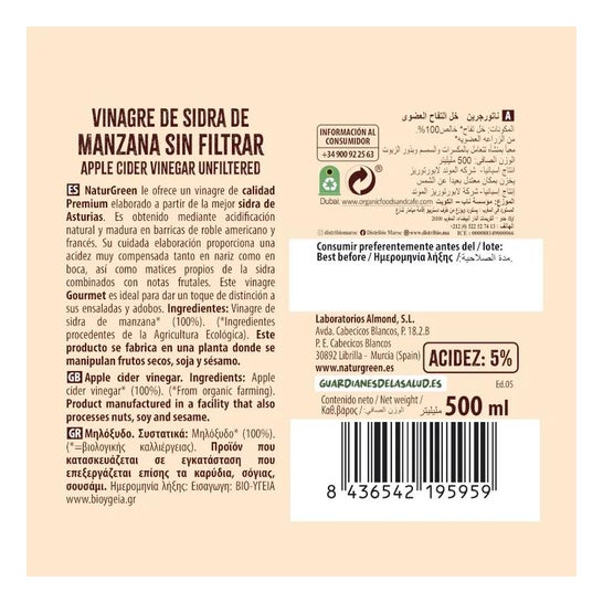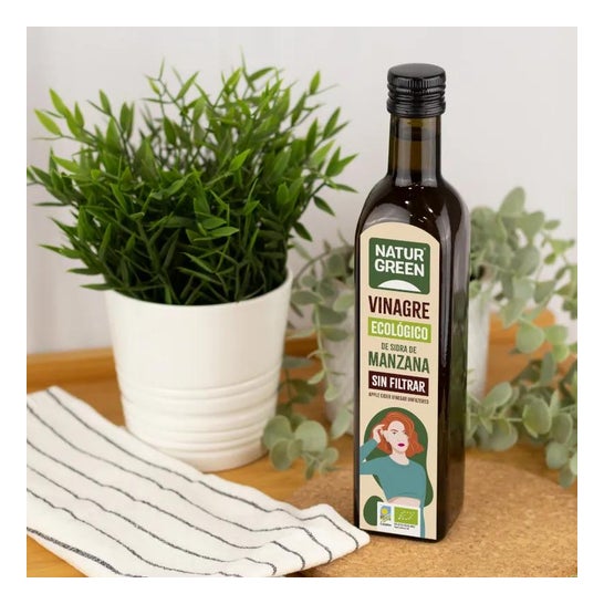 Vinaigre de cidre de pomme non filtré, avec des ingrédients issus de l'agriculture biologique et avec une acidité de 6%.